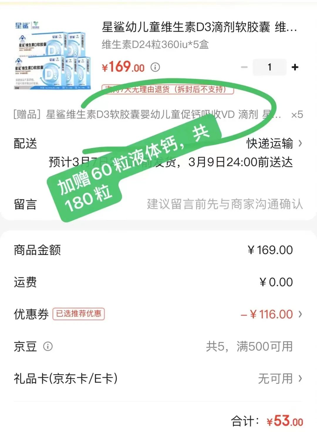 旗舰店,原价169元,领20元券和96元券,实付53元到手120粒维生素D3软胶囊+60粒液体钙,共180粒 折0.29元/粒!
