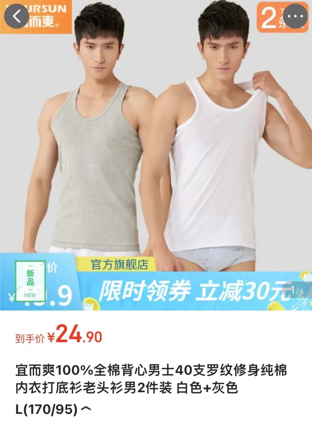 2、宜而爽 纯棉男士背心2件装,24.5元