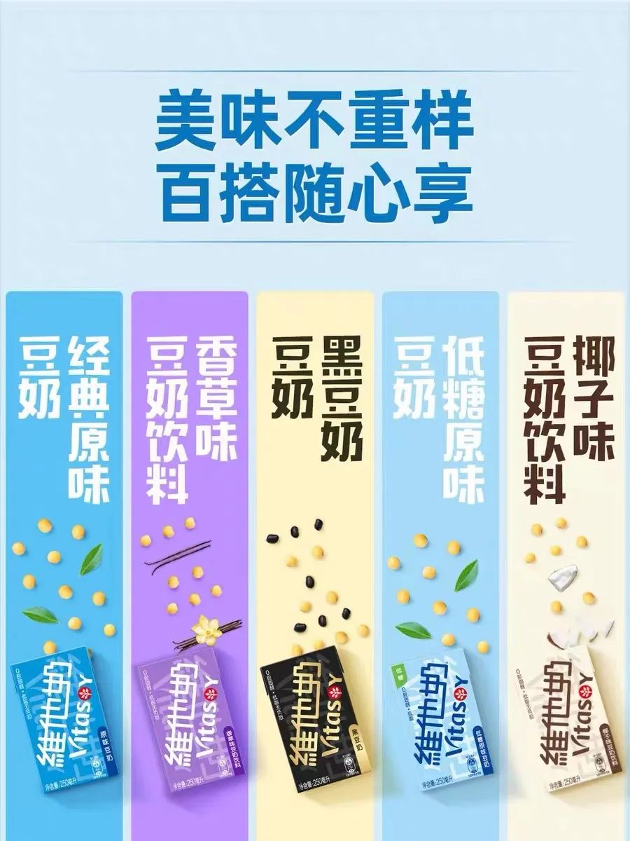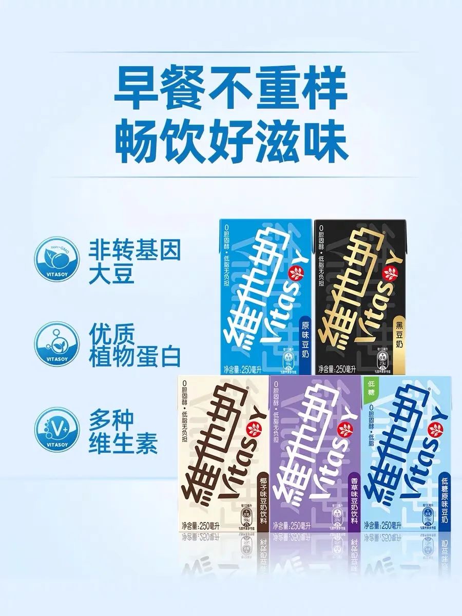 多口味豆奶,好喝不重样,优质植物蛋白易于消化吸收,好喝还低脂,不是特别甜。
