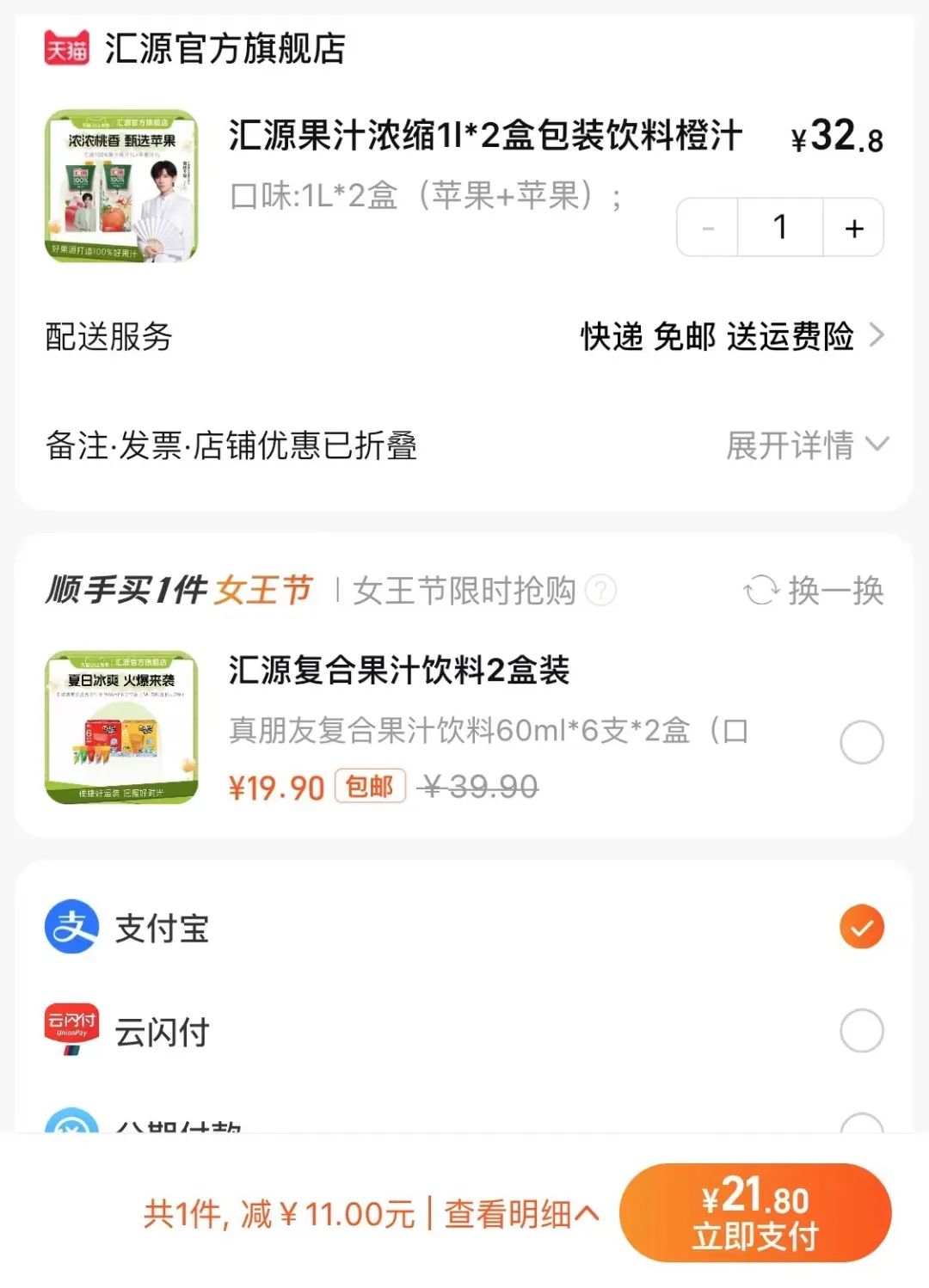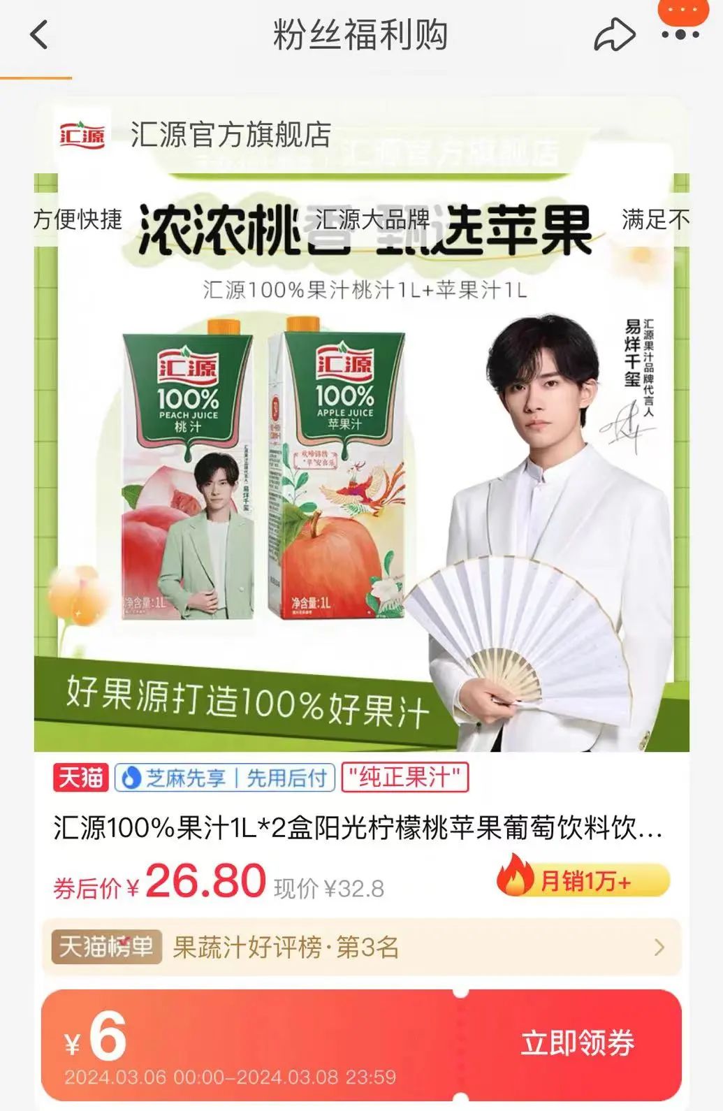 汇源果汁,近30年的老品牌了,没有科技和狠活,富含多种维生素,苹果汁、桃汁、葡萄汁、阳光柠檬可选。