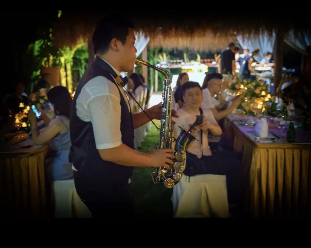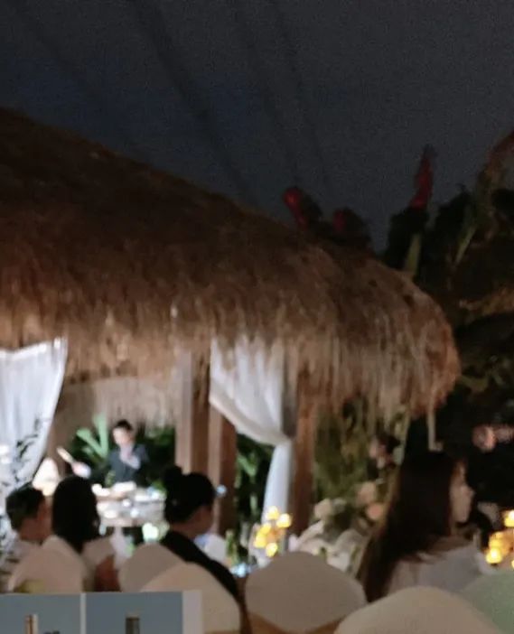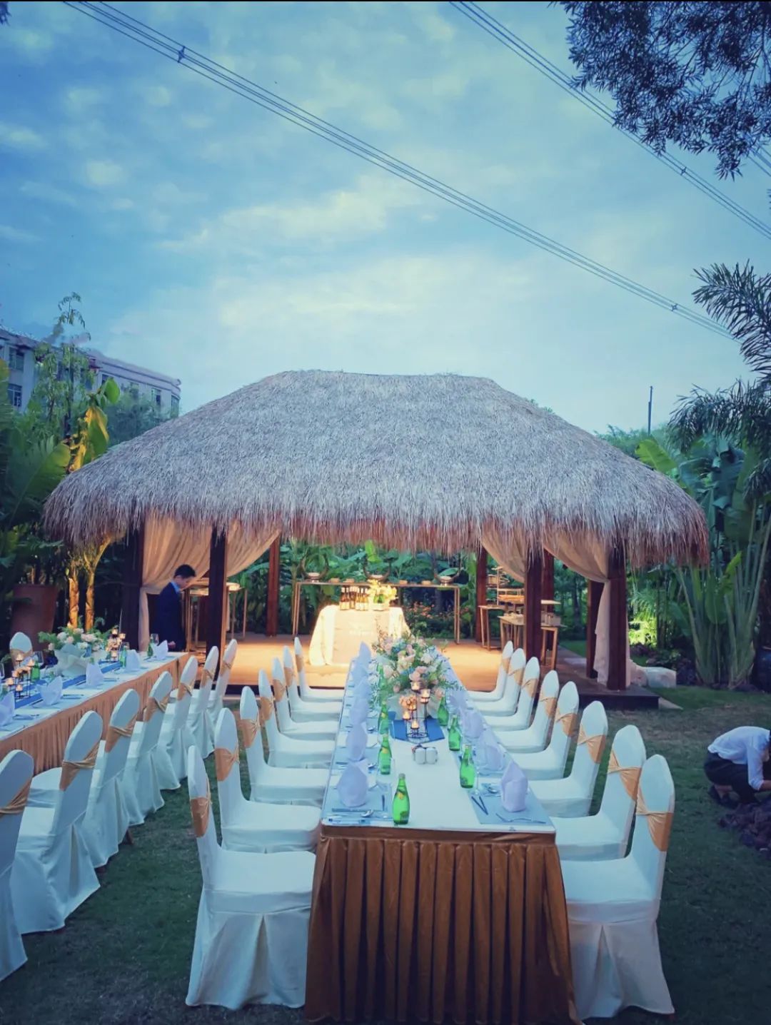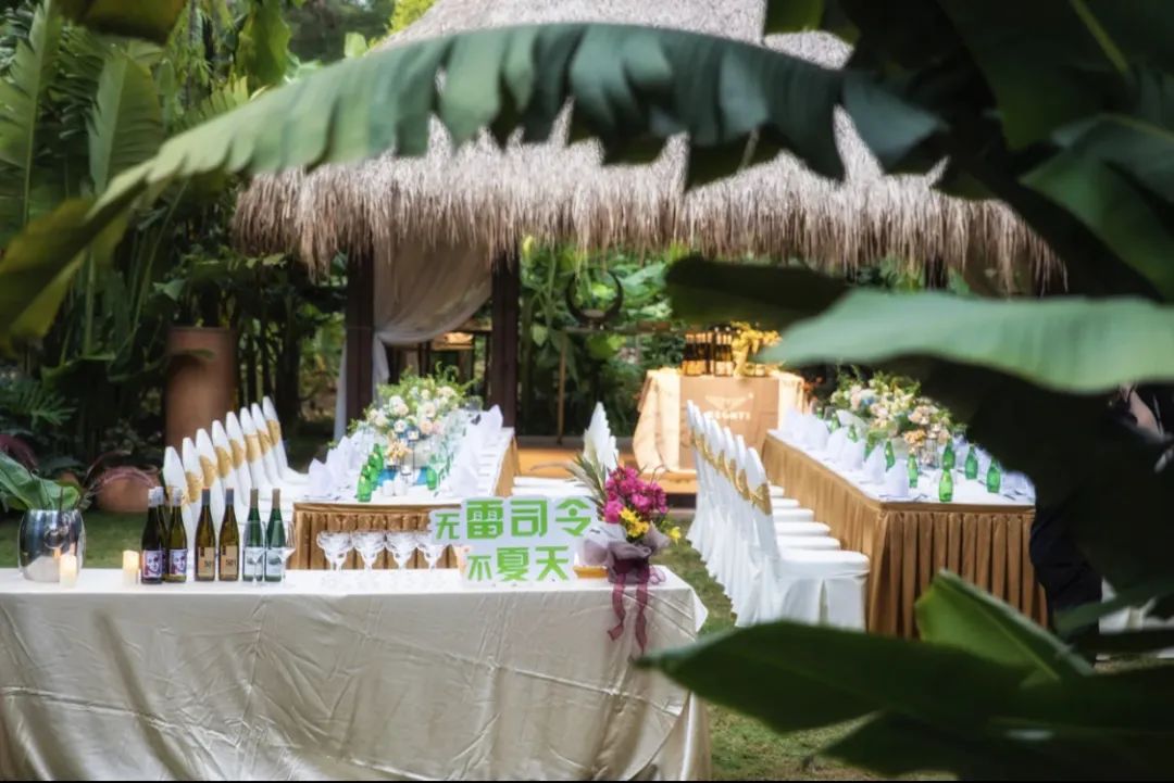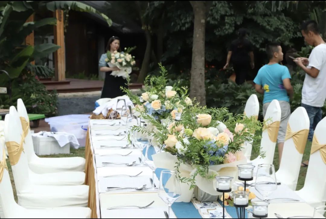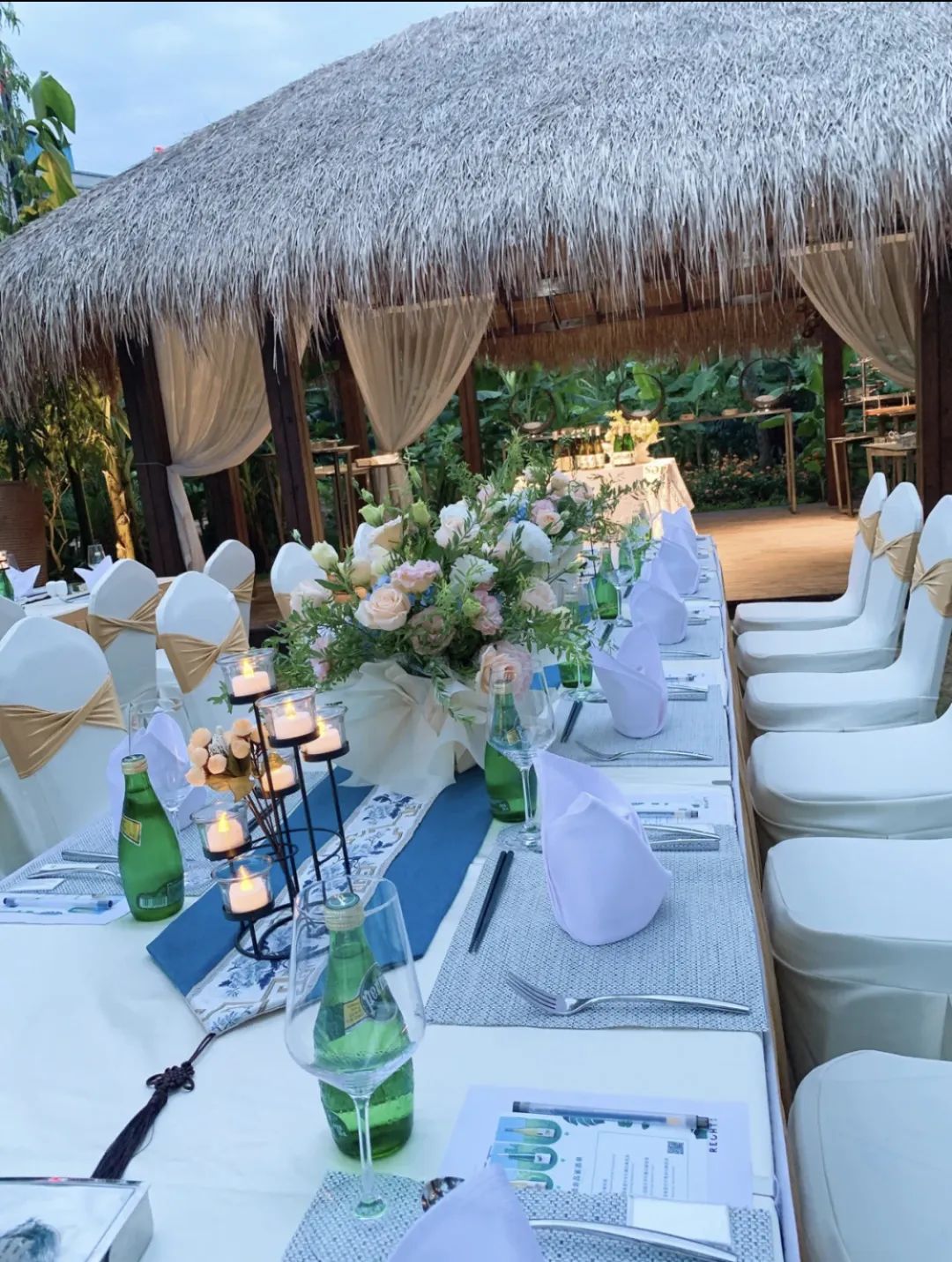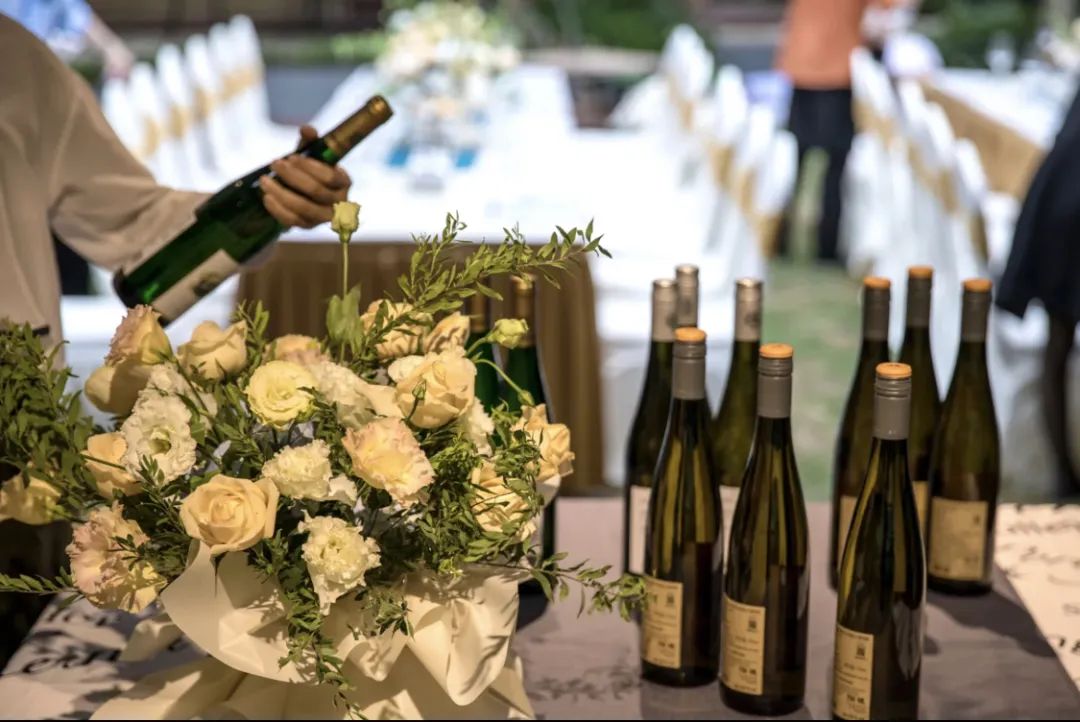 桌上摆放的香槟色玫瑰,与酒(香槟)相呼应,香槟色给人优雅沉着的感觉。不止是花,还有椅背上的金色蝴蝶结装饰,也给人一种优雅的感受。