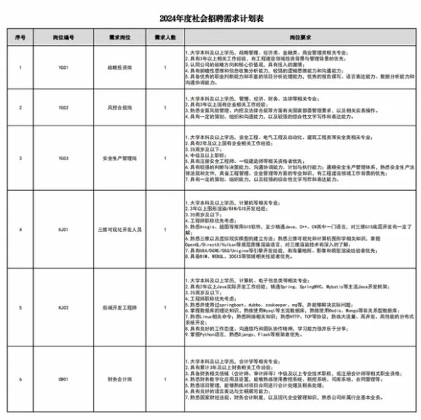 通用技术集团工程设计有限公司(原煤炭工业济南设计研究院有限公司,以下简称“通用设计”)成立于1953年,2007年加入中央直接管理的国有重要骨干企业——中国通用技术集团。公司持有工程咨询、煤炭工程、建筑工程、工程勘察等14项甲级资质,市政、电力、环境工程等23项乙级资质,1项工程监理综合资质,地基基础工程专业承包贰级资质以及压力管道资质等2项其他资质,拥有安全生产许可证。公司可承担工程咨询、工程勘察、测量、工程设计、工程监理、项目管理及工程总承包、设备系统集成、全过程工程咨询等建设项目全寿命周期服务,具备为工程建设和运营提供全方位、全产业链条的资质和能力。近年来,通用设计聚焦勘察设计、绿色产业、全过程工程咨询三大业务板块,坚持以推动高质量发展为主题,坚持以科技创新为引领、以业务发展为导向、以品质服务为基础,坚持以深化改革为动力、以人才战略为支撑、以风险防控为保障,坚持高效率、高效益、高效能,坚持自信、自立、自强,加快向全过程工程咨询综合服务商转型,努力成为国内一流的全过程工程咨询综合服务商。本次公开招聘为社会招聘。具体招聘岗位及资格条件,如下:1.具有中华人民共和国国籍,能认真贯彻执行党的路线方针政策和国家法律法规,具有良好的思想品德和道德素质,遵守社会公德。2.干事创业意愿度强,认同企业文化,爱岗敬业,业绩突出,自觉维护企业核心利益。3.具有履行岗位职责所必需的专业知识、经验和技能,强烈的事业心和工作责任感、进取精神和团队合作精神。4.具有良好的职业操守,品行端正,遵纪守法,诚实守信,公私分明,严守底线,廉洁从业。6.曾受过刑事处罚和曾被开除公职的、有应回避亲属关系的以及法律法规规定不得聘用的其他情形人员不得报名应聘。联系方式:周老师 电话:0531-68931397报名截止后,公司将针对符合招聘岗位需求的简历进行筛选。所有岗位面试采取结构化方式进行,主要考察应聘人员综合素质、业务能力及岗位所需的专业理论知识等。通过初试的人员公司统一进行复试,复试形式包括二轮面试、笔试、人才测评等。通过复试并确定入职意向的人员,公司将开展背景调查工作。3.提供一日三餐、单身公寓;双休,享受国家法定节假日和带薪年休假。1.应聘人员应确保本人提供信息的真实性。凡弄虚作假者,一经查实,即取消录用资格。2.招聘期间,将以短信、邮件或电话等方式通知入围者有关事宜,未入围者不再另行通知。3.公司承诺对应聘人员所提供的个人信息保密,并仅用于招聘工作使用。4.请应聘人员将《报名表》《汇总表》以及相应证明材料,发送至指定邮箱(文件大小须控制在20M以内)。5.具体填报材料要求,请查看附件,不按要求报送材料的,视为不合格材料。附件1:通用技术集团工程设计有限公司-社会招聘报名表.docx附件2:通用技术集团工程设计有限公司2024年社会招聘报名汇总表.xlsx免责声明:文章内容如涉及作品内容、版权和其它问题,请在30日内与本公众号联系,我们将在第一时间删除内容。