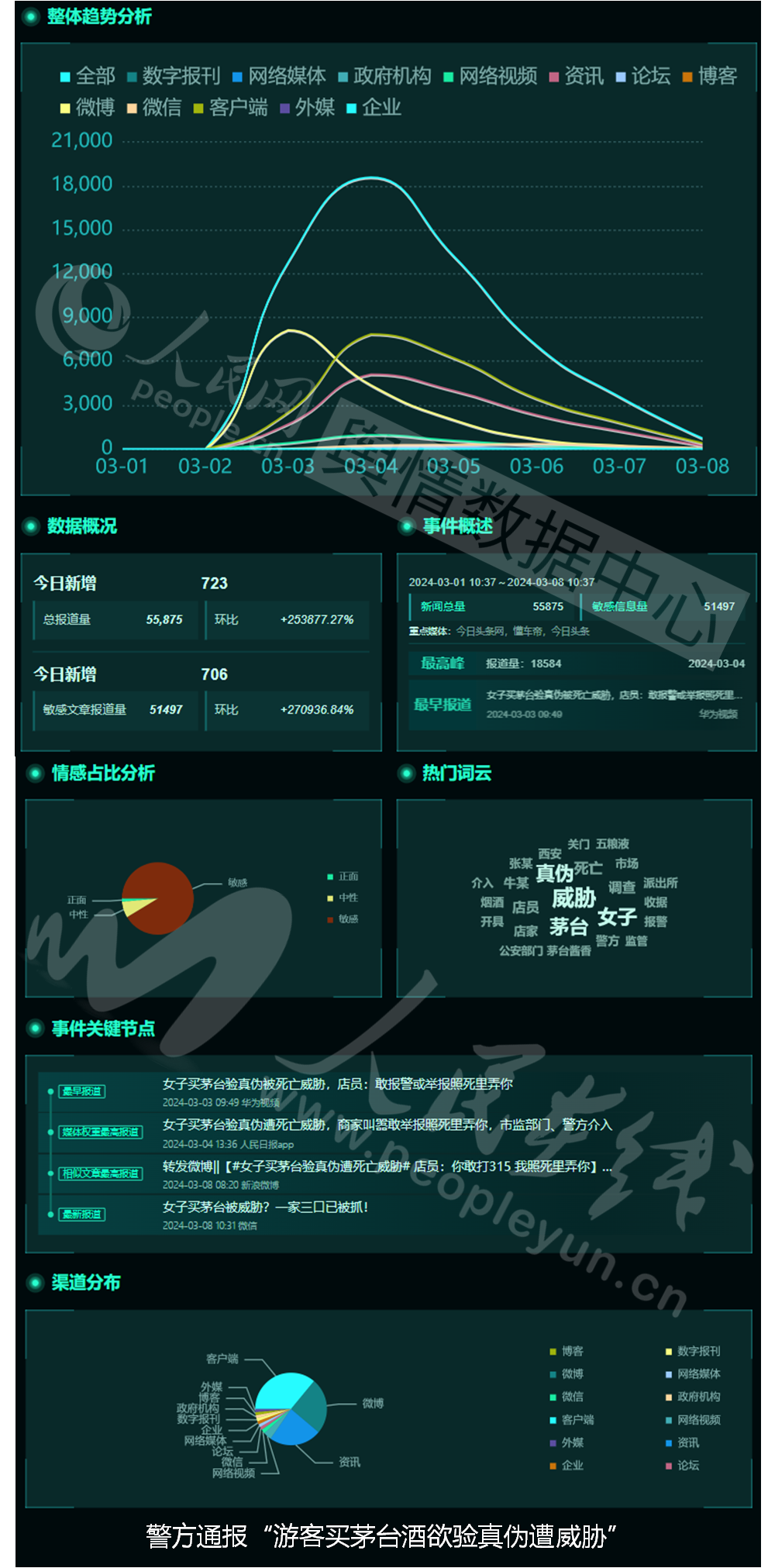 3月5日,公安、市场监管部门对网传“女子买茅台验真伪被店员威胁”一事作出回应。经公安部门调查,房某、张某二人近日在牛某1(男,61岁)经营的烟酒店购买2瓶茅台酒,要求牛某1抄写防伪码并开具收据时,牛某1予以拒绝并威胁房某、张某。随后,牛某1、牛某2(男,35岁,牛某1之子)和孟某(女,60岁,牛某1之妻)欲从房某手中抢回两瓶酒,拉扯过程中,将房某拉拽倒地,并将两瓶酒摔碎。西安市公安局经开分局称,牛某1、牛某2、孟某的行为涉嫌犯罪,已依法对该三人采取刑事强制措施,对该店涉嫌销售假酒等问题开展进一步侦查调查。西安市市场监管局经开分局回应媒体表示,已对涉事烟酒店销售的茅台酒进行了查封并立案调查,将依法依规进行处理。目前,涉事门店已闭店,门口贴有封条。话题舆情基本面如下: