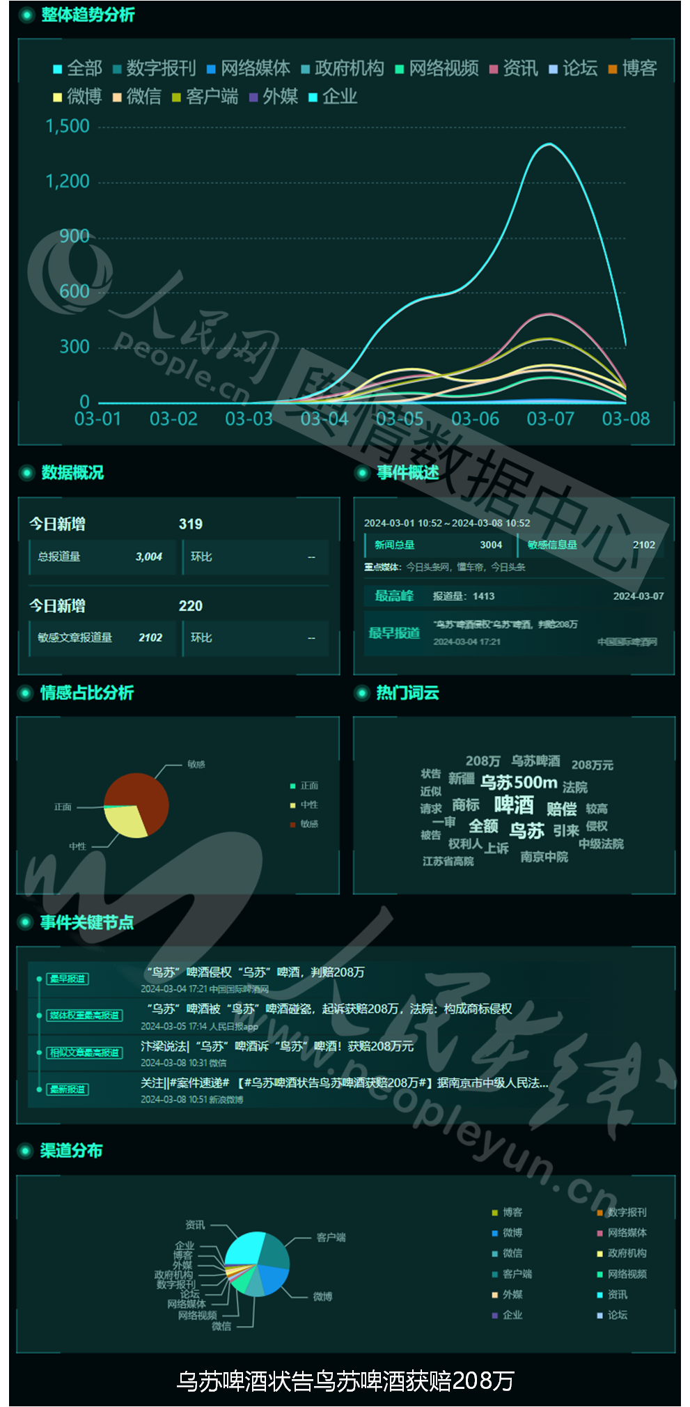 3月4日,南京市中级人民法院官方公众号发文称,南京中院审结的一起商标侵权及不正当竞争纠纷案件判决日前已生效。侵权人极力攀附模仿红罐装“乌苏”啤酒,生产和销售红罐“鸟苏”啤酒,南京中院一审全额支持了权利人208万的赔偿请求。江苏高院二审维持原判。南京中院经审理认为,被诉侵权“鸟苏”啤酒使用的标识与原告的涉案注册商标相比较,两者极为近似,易导致消费者的混淆或误认,构成商标侵权。原告产品包装装潢经长期持续推广使用,已具有较高的市场影响力和知名度。各被告作为同业竞争者在应当知晓的情况下仍使用侵权包装装潢,客观上易导致相关公众产生混淆或误认,故各被告构成不正当竞争。话题舆情基本面如下: