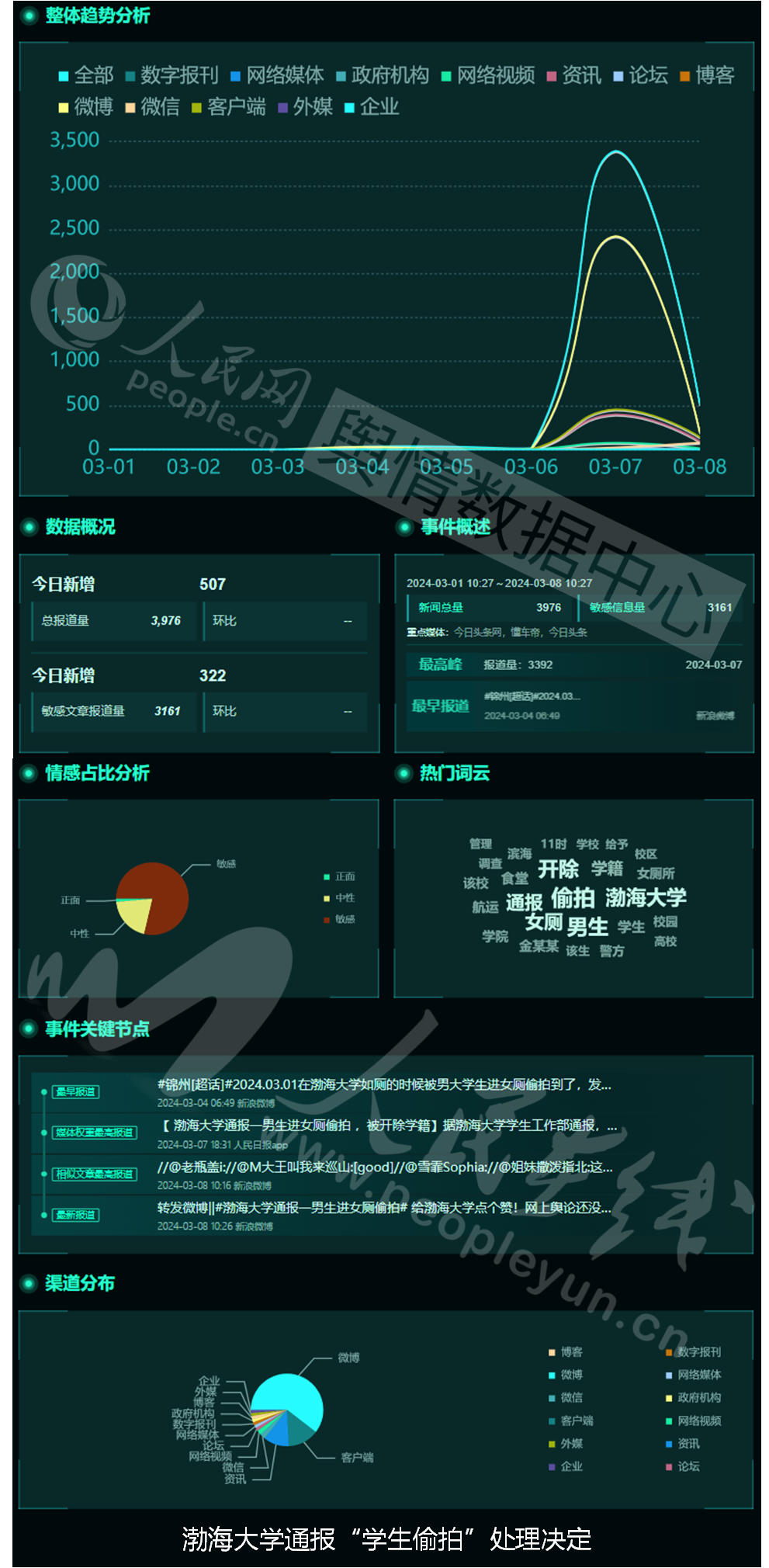 3月5日,渤海大学党委学生工作部发布情况通报称,3月1日11时许,渤海大学航运学院男生金某某进入滨海校区食堂二楼女厕所进行偷拍。涉事男生金某某已交由警方调查处理。鉴于该生所犯错误性质恶劣,影响极坏,依据学生管理相关规定,经学校研究决定,给予该生开除学籍处分。话题舆情基本面如下: