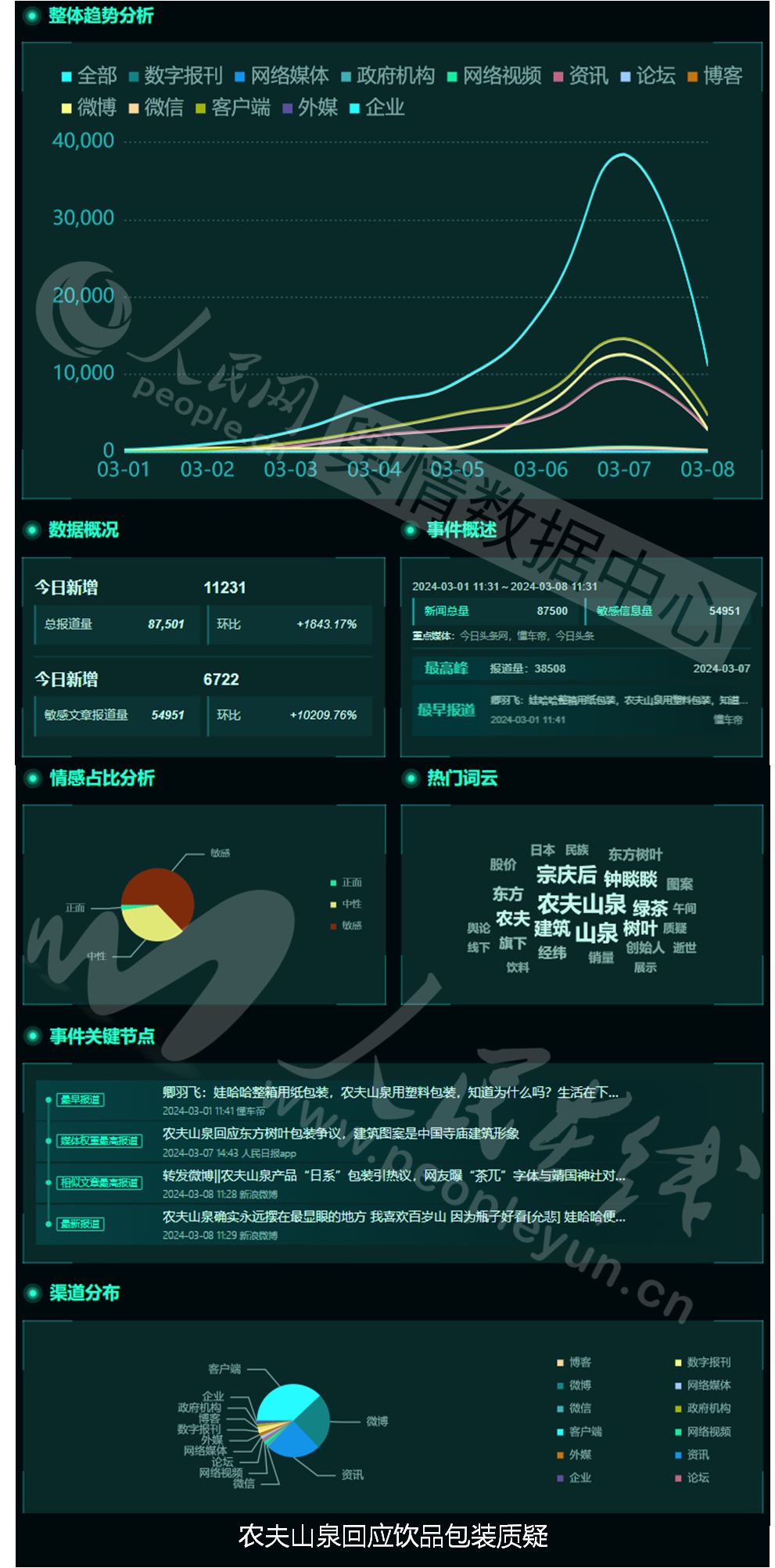 近日,有博主发文质疑农夫山泉在其饮品瓶身广告上植入过多的日本元素。对此,3月7日,农夫山泉客服回应媒体称,东方树叶绿茶产品标签上的建筑图案是根据中国的寺庙建筑形象所做的艺术创作,并不是日本的建筑;且东方树叶原味茶饮料绿茶产品标签标识文字内容是说日本的茶文化发源自中国,在多篇文献中均有描述论证,所述内容来源真实、出处明确,旨在展示中国茶及茶文化对世界的影响,展示了民族自信。话题舆情基本面如下: