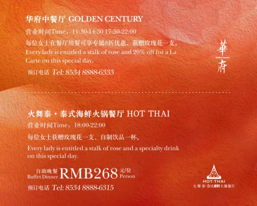 华府中餐厅 COLDEN CENTURY,每位女士在餐厅用餐可享专属8折优惠,获赠玫瑰花一支。