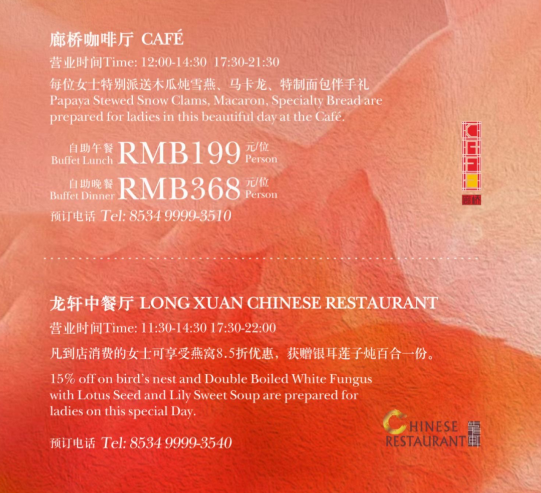廊桥咖啡厅 CAFÉ 为每位女士特别派送木瓜炖雪燕、马卡龙、特制面包伴手礼;