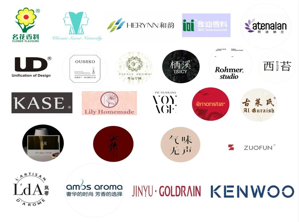 欧诗蔻、卓芬、贝博、阿诺玛、阿莫斯、 优德、怡特方、欧雅、金雨、第五感调香学院、香道尔、喜薰、浙江博聚、格迩斯、ABL艾佰伦