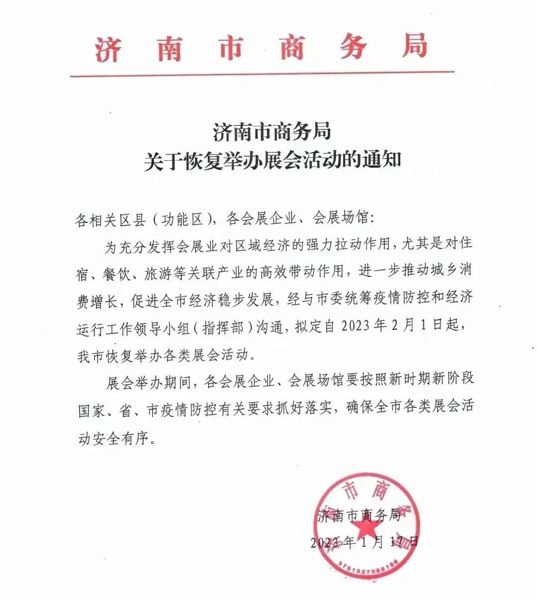 今日(1月17日),济南市商务局发布了《济南市商务局关于恢复举办展会活动的通知》。通知指出,经与市委统筹疫情防控和经济运行工作领导小组(指挥部)沟通,拟定自2023年2月1日起,济南市恢复举办各类展会活动。