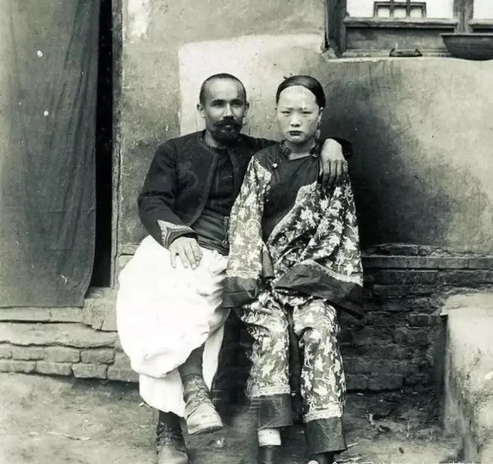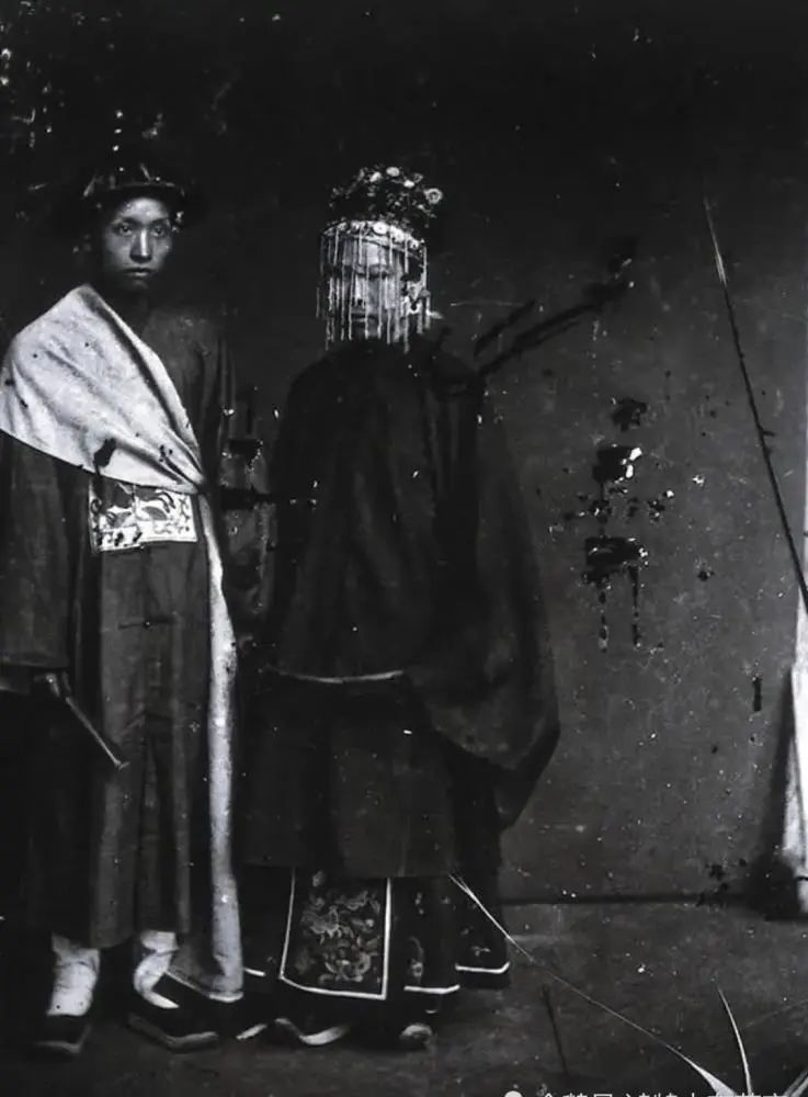 新婚夫妻合影照,妻子年龄有点大哦!对于照相,这新奇的西洋玩意总是让人心里发毛。担心灯光一闪,自己的魂就没了,所以拍出来的效果就是人显得很呆板,面容僵硬。