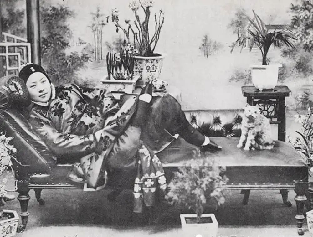 一位面容姣好的清朝女子,盘着二郎腿躺在床榻上。一只猫乖巧地在一旁对着镜头张望,室内华美,一看就是大户人家。她的小脚非常精致,这病态的美在当时是美的主流。