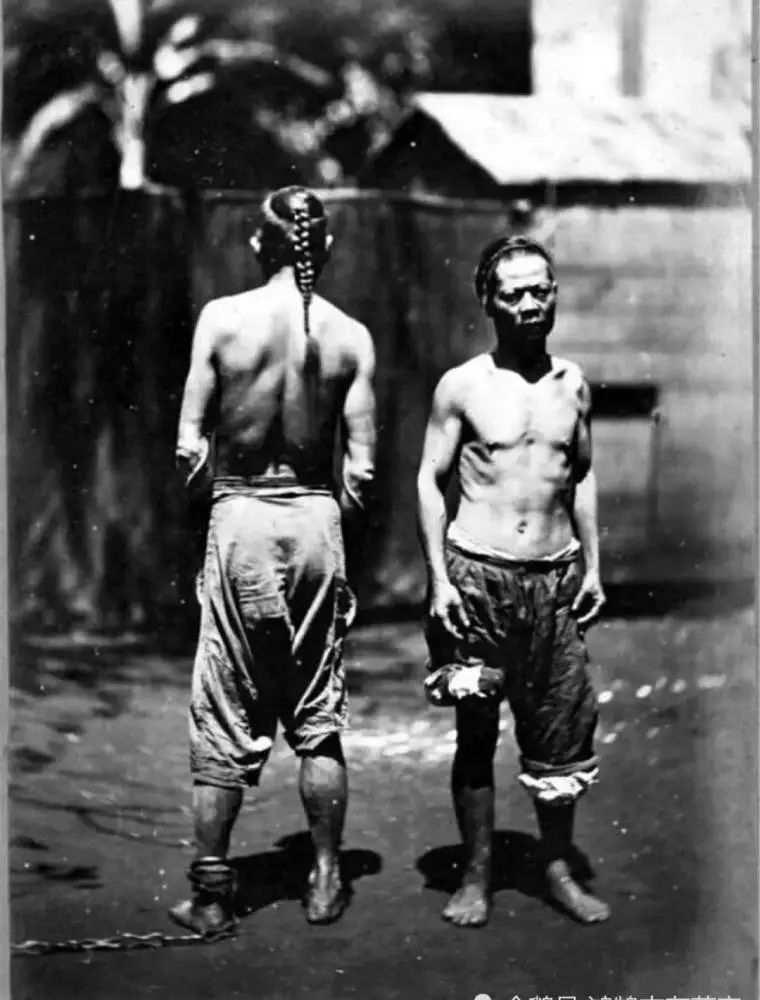 留着牛尾辫的清朝人,目光呆滞。提到大清男子,一条油光蹭亮的辫子极有辨识度。从清军入关,就提倡“剃发易服”。辫子到了大清末年,又粗又长,“阴阳头”格外的醒目。这辫子见证了大清王朝的荣辱兴衰。犯人在狱卒的看管下站在那里示众,三个人竟然用一条铁链拴着。沉重的木枷戴在脖子上,大小可以辨别他们所犯的罪行。