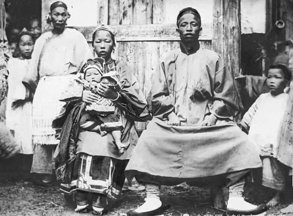 大户人家的一张全家福,男子坐姿霸气,两手紧握,面对镜头毫无怯意。正妻端庄秀丽,裹着小脚,抱着虎头帽的宝贝儿子出镜。佣人在一旁站着。