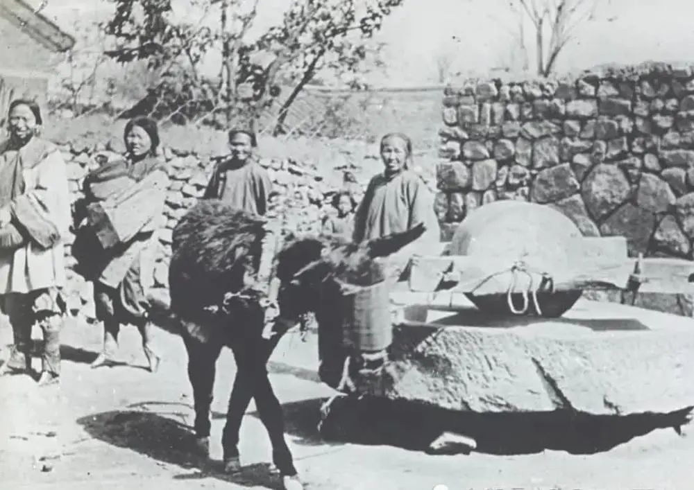 一头蒙着眼睛的驴子在推碾,几位乡下妇女在一旁看着。没有机器的年代,用驴子推碾也是一件奢侈的事情。毕竟代替了人力,如今这样的场景很少见到了。