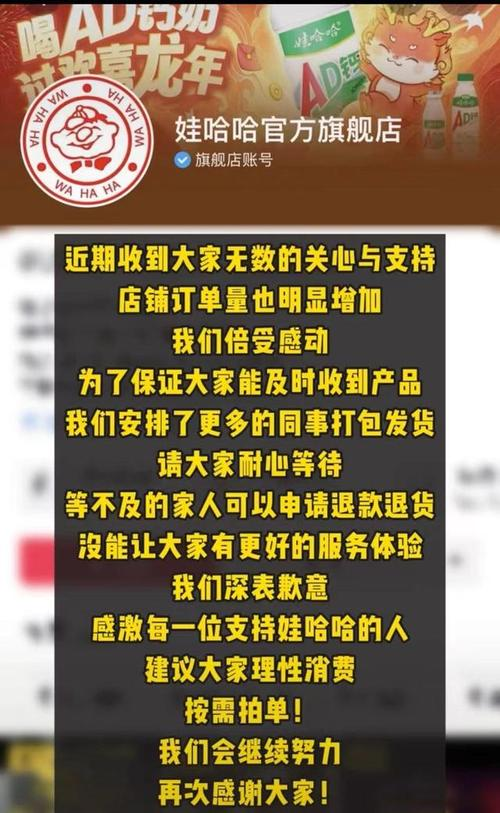 近日,娃哈哈官方旗舰店发布公告称, 近期收到大家无数的关心与支持,店铺订单量明显增加。为保证消费者及时收到产品,公司已安排更多员工打包发货,请消费者耐心等待,同时建议消费者理性消费,按需拍单。(娃哈哈官方旗舰店)Wahaha Livestream Sales Skyrocket 500% After Founder's Passing