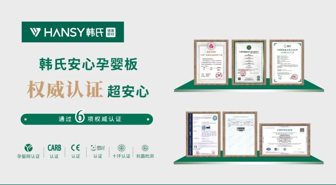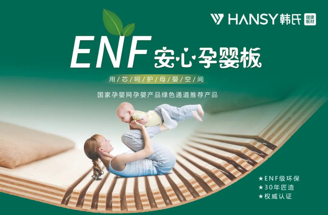 针对消费者广泛关注的环保性、耐用度、南北方气候差异问题、花色问题,韩氏研发团队用心研创,再次升级,推出韩氏安心孕婴板。韩氏安心孕婴板不仅性能稳定、环保等级达ENF,更是在饰面纸浸胶过程中添加银、钛离子,具有抗菌除霉的功效。