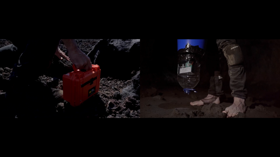展览在《无线电菌丝体阵列》的基础上向两个方向进行了延伸。作品VOIDT是一场地下表演的双屏影像,纪录了豪斯在特内里费岛(Tenerife)一个空旷火山洞内的环形行走。当宇宙射线穿过大气层时,会产生大量新的亚原子粒子,而μ介子(muons)就是其中之一。μ介子无处不在且以近光速穿梭身体与物体,这一特质为科研工作中了解看不见的材料和尺寸提供了一种观察手段,如通过测量小范围内的μ介子入射率,便可了解探测器上方或一侧结构的材料性质和密度,这一方法也被称为μ介子射线照相术(muography或μography)。利用这一方法,艺术家赤脚走入火山洞,通过μ介子进行书写。每当宇宙射线撞击移动设备时,就会有少量的火山沙沉积下来。地质景观的实时演变是一场缓慢的过程,带有“中间”意味的μ介子是悬浮在火山坑洞之中的深渊,如蒂莫西·莫顿(Timothy Morton)在《庞大之物》(Hyperobjects)中所提到的,这种“之间”并不在时空中——它本身就是时空。人们可以通过μ介子所提供的中间状态观察临时信号中的深时结构,感知不可见的空隙物质(void material)。