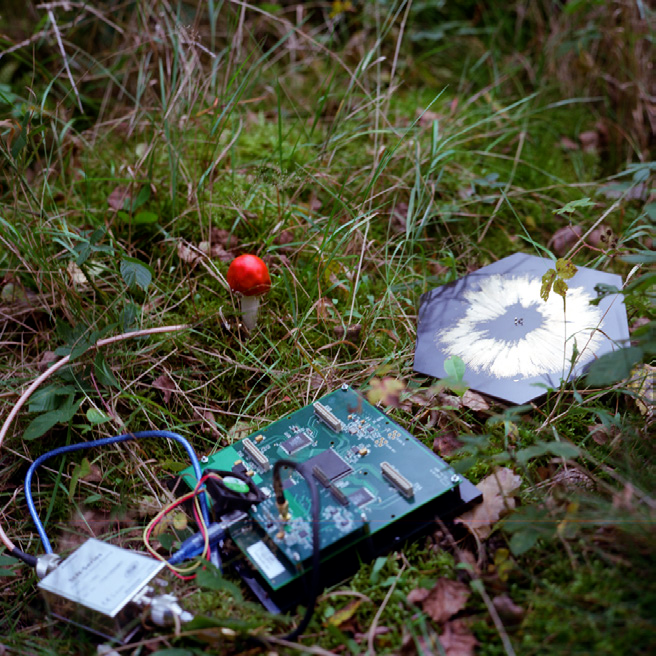 通过观察到射电望远镜的阵列与毒蝇伞菇(Amanita Muscaria)的辐射式环状生长存在着相似之处,豪斯开启了《无线电菌丝体阵列》(Radio Mycelium Array)项目,尝试在无线电通信网络与菌丝网络之间进行一场跨孢子与信号的连结。以动物磁力学、遥感生物传感以及星际通信捕捉方面的前人探索为基础,豪斯探索了非人类实体如何扮演探测器与精神向导的角色,激发扩散式的替代性想象。在《无线电菌丝体阵列》中,灵芝成为接收宇宙信号的天线,在蕈圈中接收来自同一天体的无线电波,组合成一副更大的电磁宇宙视图。在这个语境中,菌丝网络不仅是咀嚼污染物与死亡的分解者,纠缠着跨物种共生的智慧,更是蔓延在土壤中的皮肤,传导着起伏的无线电位信号,调理着精神化学的新陈代谢。《无线电菌丝体阵列》的菌菇装置缓慢地对地质进行编码,不仅网罗着根系的絮语,也记录着光子交换(photonic exchanges)的吟唱。星辰与孢子以这样富有想象力的方式结合在一起,辐射出一个新的磁场,并重新编码这一场域的心理-地理-物理。