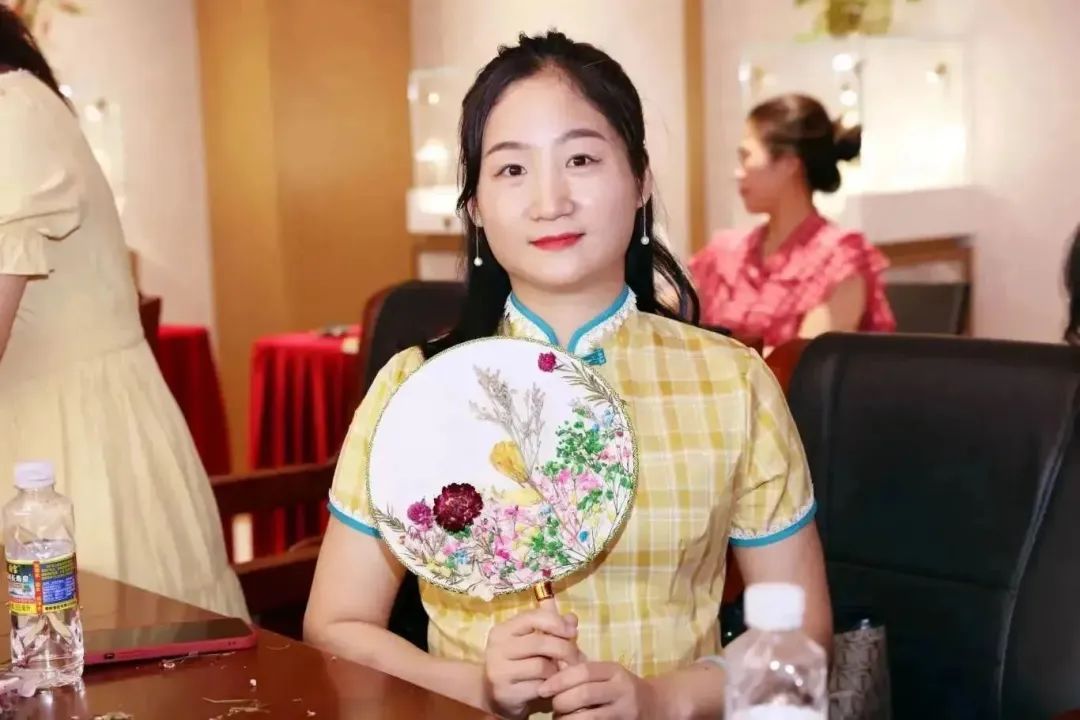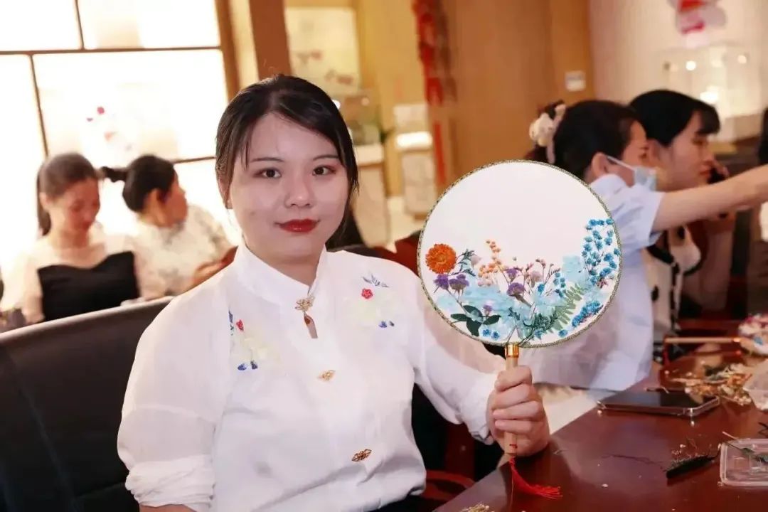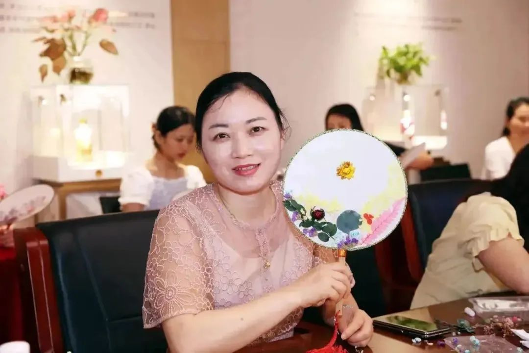 大家纷纷与自己的团扇作品拍照留念,手中轻握团扇,微风携带着花香韵味,仿佛置身于花团锦簇的人生画卷中,美丽与愉悦相伴而行。活动现场洋溢着欢声笑语,传递着幸福与快乐的氛围。