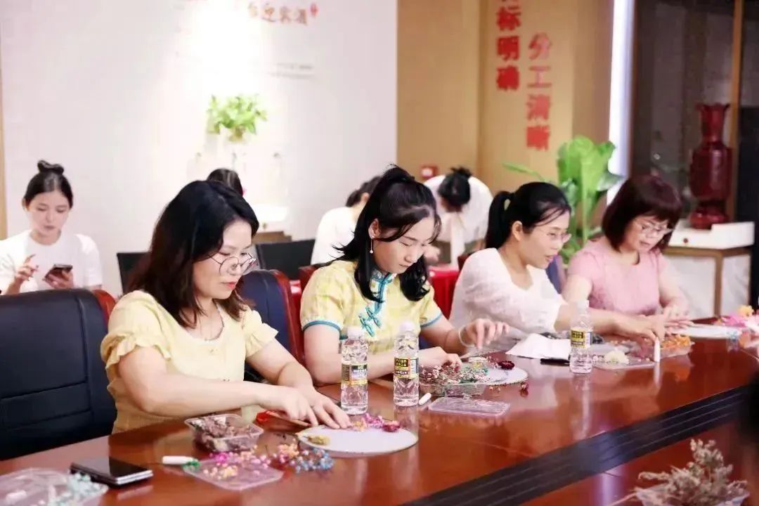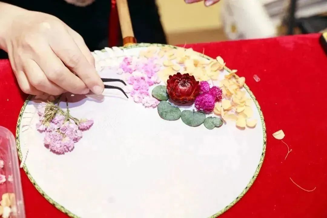 活动伊始,花艺老师向女职工们讲授花材用途、团扇制作步骤、造型等制作技巧。大家相互交流、巧妙构思,运用自己的创意和想象力,用干花在素白的团扇面上创意搭配,再用胶水小心翼翼地粘住,固定好干花的位置。用一花、一叶、一妙手创作出兼具传统文化底蕴和实用性的团扇作品。