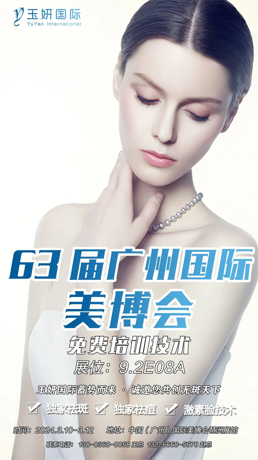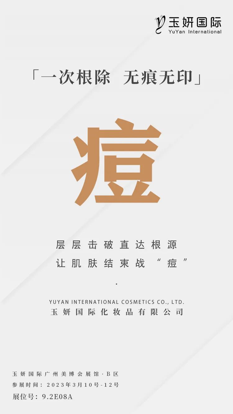 这个春天,第63届CIBE广州国际美博会将于2024年3月10日-3月12日在广州琶洲展馆举办,玉妍国际诚邀您参观洽谈,共商合作。