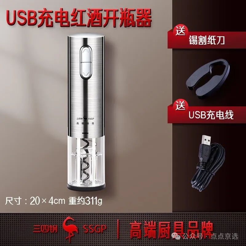 三四钢(SSGP)电动红酒开瓶器真空酒塞家用葡萄酒启瓶器起子全自动开酒器套装 电动开瓶器+割锡纸刀+usb线