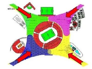 人流流向一般以纵向为主(出入口至看台),小区划分应以垂直为主,小区边界应设在人流较少的区域,避开走道。
