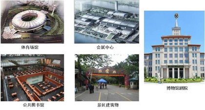 大型会展中心类型较多,根据场馆功能的不同可分为体育场馆、会展中心、公共图书馆、景区建筑物、博物馆剧院。