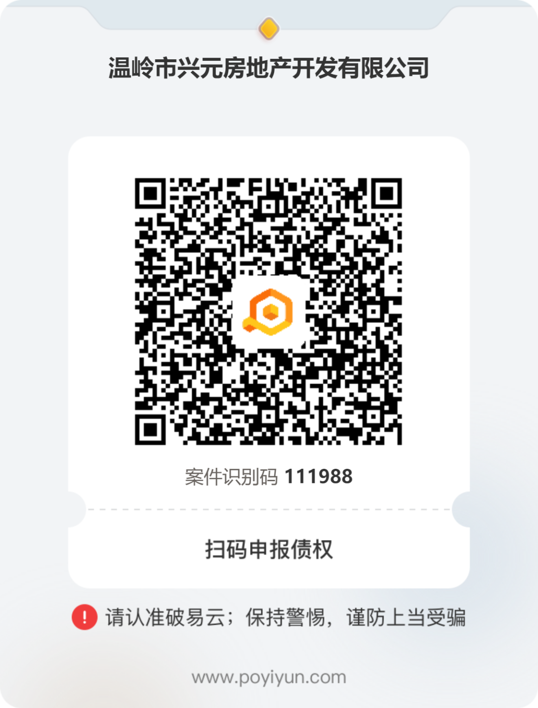 2、手机微信扫描本须知后附的自主申报二维码,债权人根据提示完成登录、债权申报,本案件识别码111988。