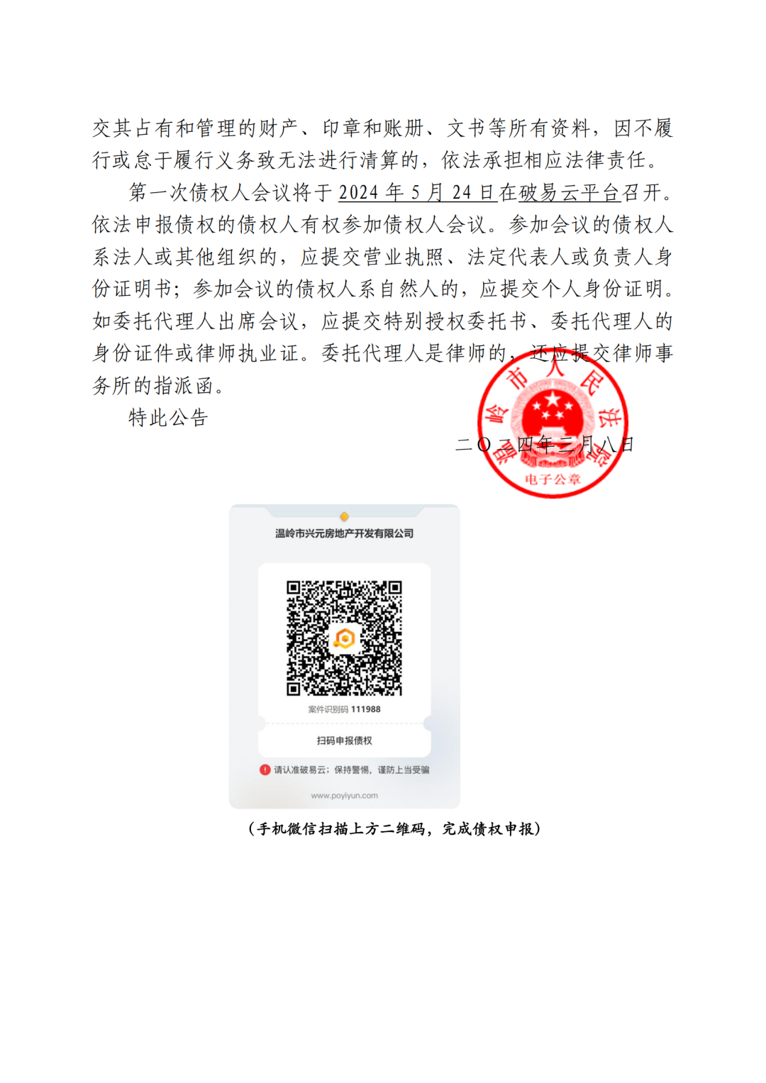 (手机微信扫描上方二维码,完成债权申报)