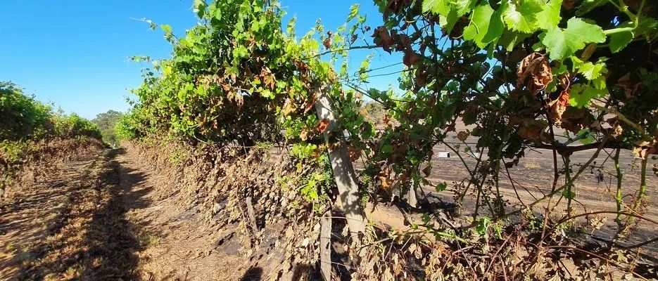 Nearby, the remains of 1.1 million vines that once comprised one of Australia’s largest vineyards were piled in heaps of gnarled and twisted wood as far as the eye could see.