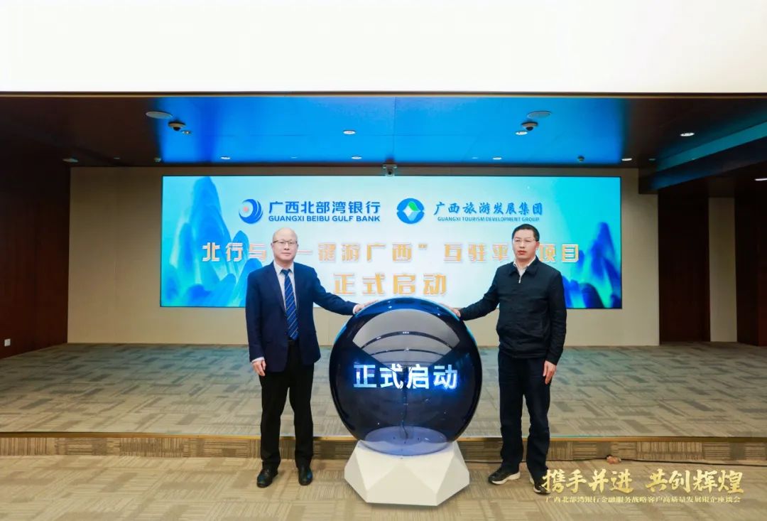 近日,由广旅会展公司策划执行的“携手并进 共创辉煌”广西北部湾银行金融服务战略客户高质量发展银企座谈会顺利完成。广西旅游发展集团副总经理韦贵儒出席活动,并与广西北部湾银行副行长陈捷共同启动北部湾银行与广西旅游发展集团“一键游广西”APP互相入驻项目。