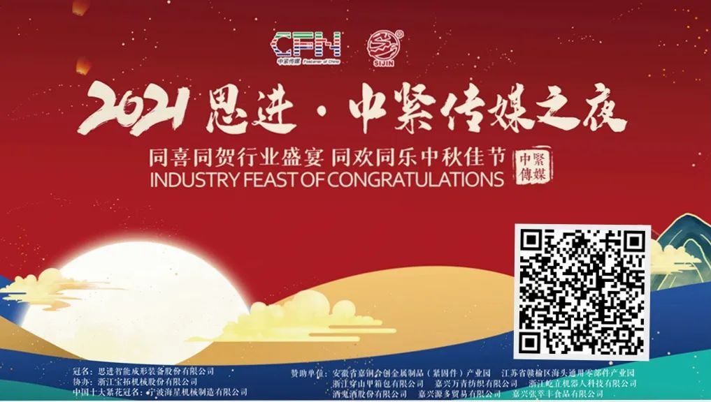 每年的晚宴总是万众瞩目,直播观看人数也是逐年增加,今年中紧直播依然将对晚宴进行全程直播,没能来到现场的朋友请一定锁定直播间。2021思进·中紧传媒之夜由中紧传媒、浙江省紧固件产业技术联盟主办,由思进智能成形装备股份有限公司冠名,由浙江宝拓机械股份有限公司协办,宁波海星机械制造有限公司冠名“十大紧花”评选,安徽省嘉铜合创金属制品(紧固件)产业园、江苏省赣榆区海头通用零部件产业园、浙江穿山甲箱包有限公司、嘉兴万青纺织有限公司、浙江屹立机器人科技有限公司、酒鬼酒股份有限公司、嘉兴源多贸易有限公司、浙江张萃丰食品有限公司倾情赞助。
