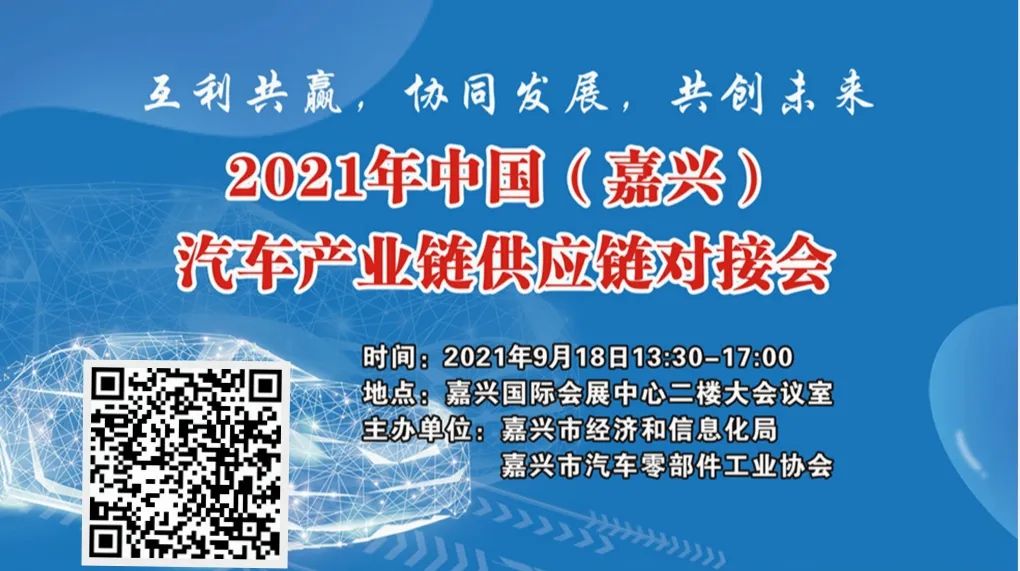 第三场:2021年中国(嘉兴)汽车产业链供应链对接会2021年中国(嘉兴)汽车产业链供应链对接会由嘉兴市经济和信息化局、嘉兴市汽车零部件工业协会主办,本次对接会立足嘉兴汽车零部件产业发展整体优势,结合资源共享、技术交流、创新协作发展方向,致力于汽车零部件产业的高质量发展,全力促进汽车生产企业与零部件制造企业产需双方沟通交流,推动产品研发生产与市场渠道的产销、采供深度融合,充分展示嘉兴市优秀的汽车零部件企业,宣传嘉兴市汽车零部件产业优秀成果。