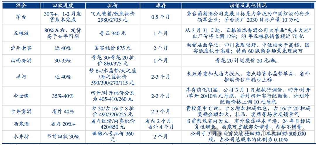 Q1头部酒企报表端确定性仍强。结合渠道前瞻指标反馈,一是24年酒企规划延续积极,节前头部酒企与渠道签订的合同配额普遍延续增长,未有明显降速,扩张型次高端小酒亦积极谋求改善。二是 Q1 回款完成度较好,头部酒企多数已完成 Q1 回款目标,部分进度略滞后的酒企将继续追加回款。三是春节开门红支撑较足。白酒春节动销正月后环比好转明显,整体预计同比微增,且库存未进一步累积。因此判断白酒 Q1 报表端确定性仍强,但值得注意的是,今年春节酒企允许渠道使用票据的情况增多,报表现金流或有一定影响。