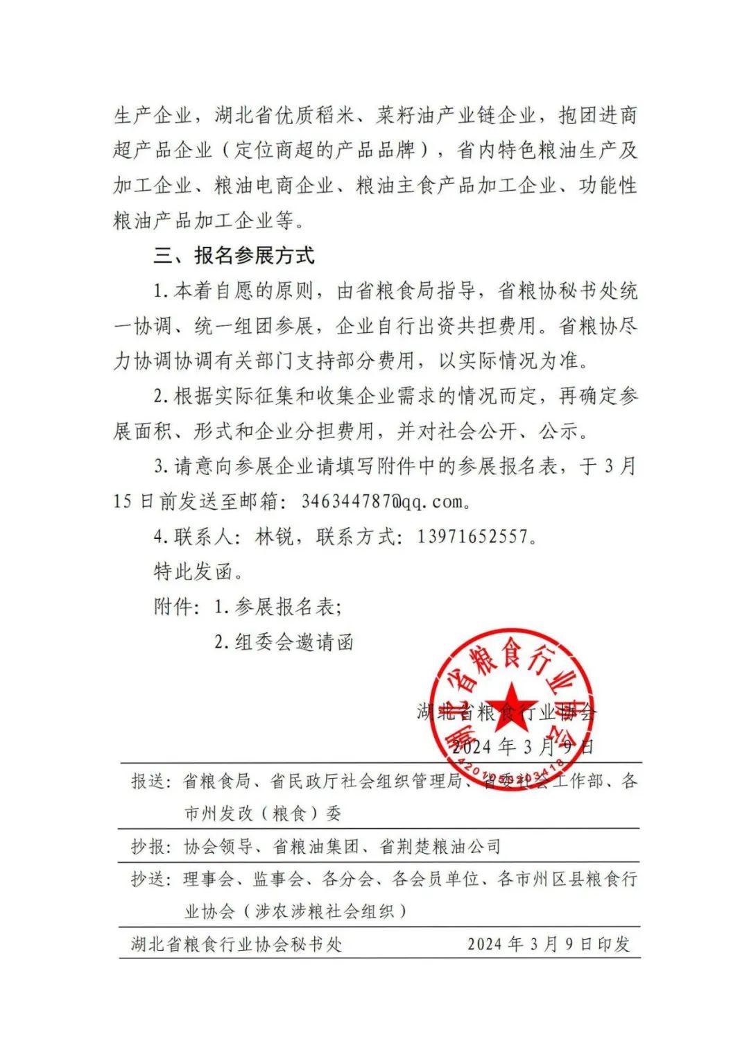 2.拟征集参展企业类型:功能性粮油及主食食品深加工生产企业,湖北省优质稻米、菜籽油产业链企业,抱团进商超产品企业(定位商超的产品品牌),省内特色粮油生产及加工企业、粮油电商企业、粮油主食产品加工企业、功能性粮油产品加工企业等。