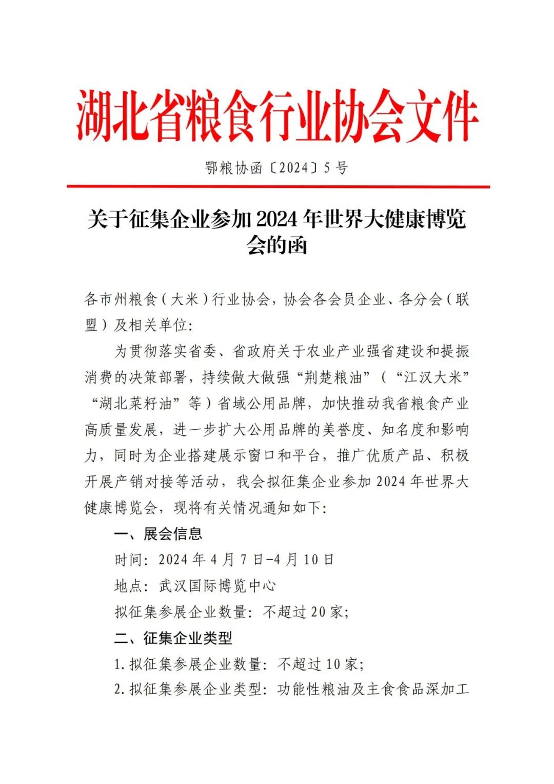为贯彻落实省委、省政府关于农业产业强省建设和提振消费的决策部署,持续做大做强“荆楚粮油”(“江汉大米”“湖北菜籽油”等)省域公用品牌,加快推动我省粮食产业高质量发展,进一步扩大公用品牌的美誉度、知名度和影响力,同时为企业搭建展示窗口和平台,推广优质产品、积极开展产销对接等活动,我会拟征集企业参加2024年世界大健康博览会,现将有关情况通知如下: