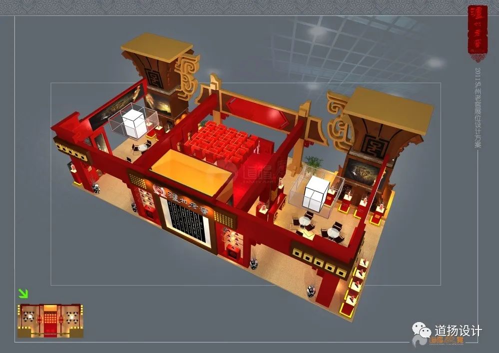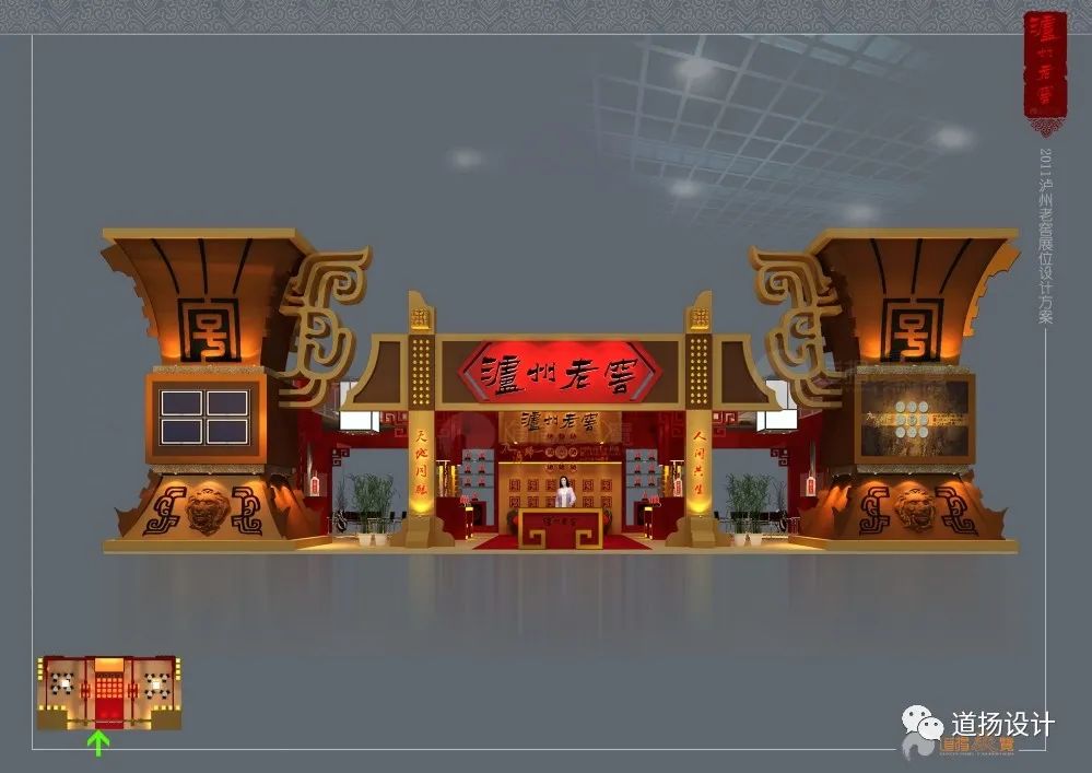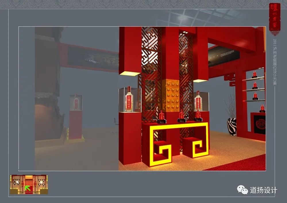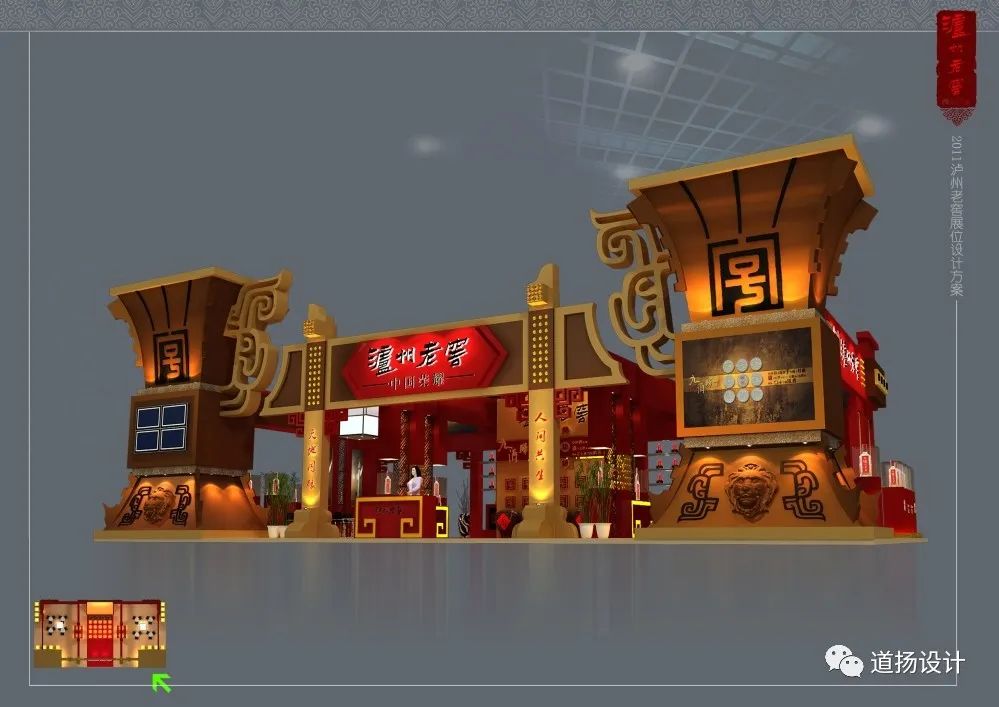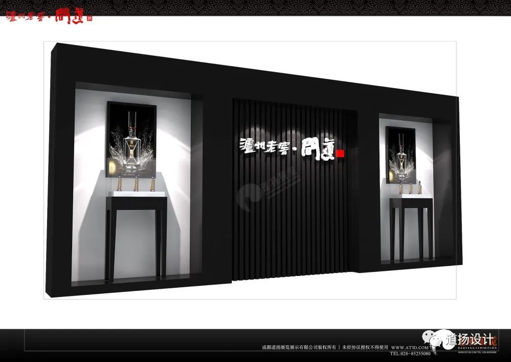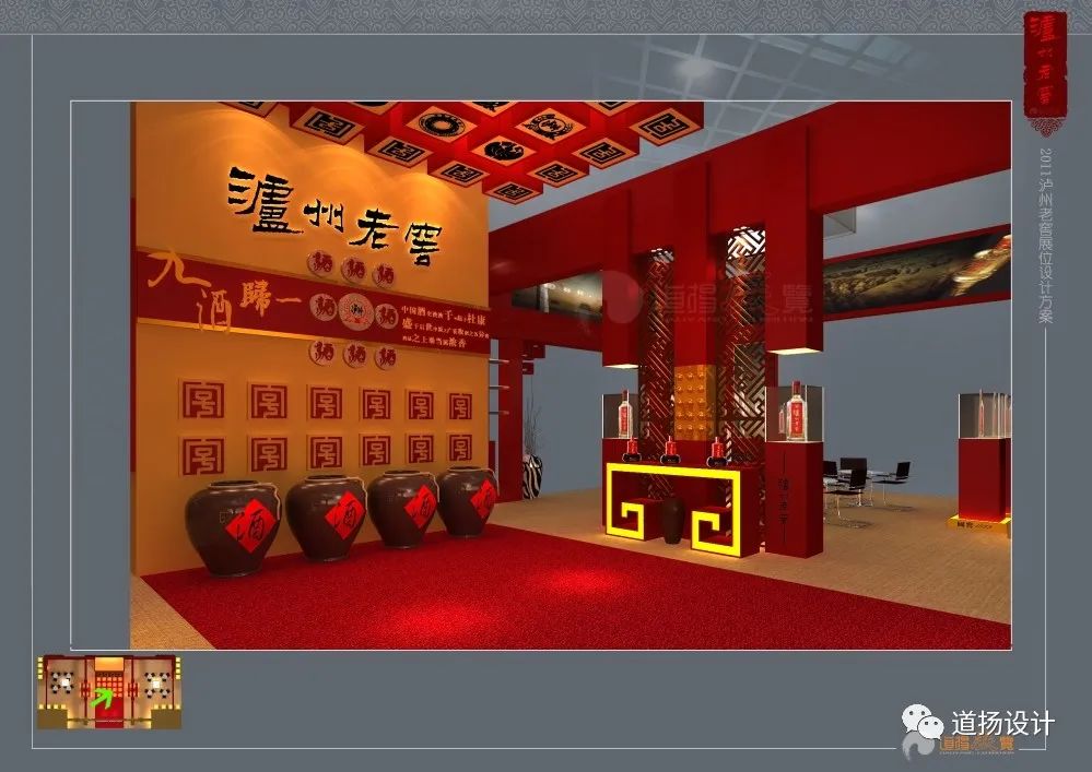 将贯穿整个展位的“回形纹”“铜扣”等中国传统文化元素与精品产品展柜相结合,与泸州老窖窖龄酒合理布局,体现展位的恢宏气势、和不可复制性,将“泸州老窖”品牌深厚的企业文化内涵,形象直观地传达给客户。