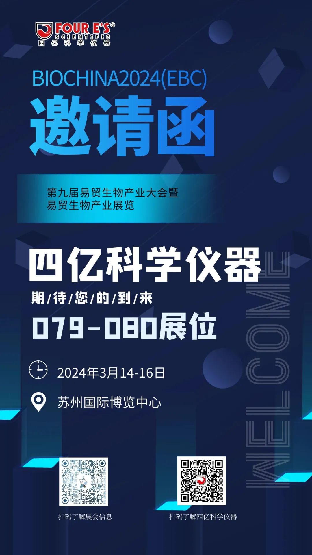 BIOCHINA2024第九届易贸生物产业大会暨易贸生物产业展览(EBC)将于2024年3月14-16日在苏州国际博览中心盛大召开。FOUR E'S四亿科学仪器在F馆F079-080展位欢迎您的到来!