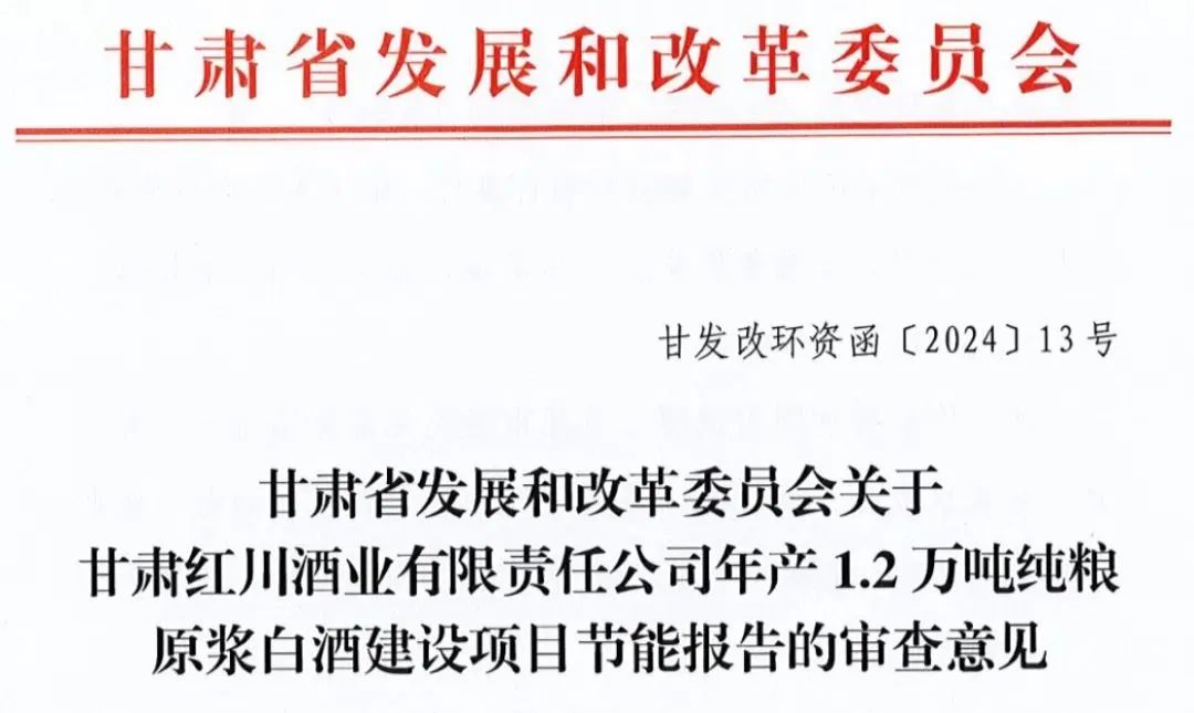 近日,甘肃红川酒业有限责任公司年产1.2万吨纯粮原浆白酒建设项目获得省发展改革委节能审查批复。