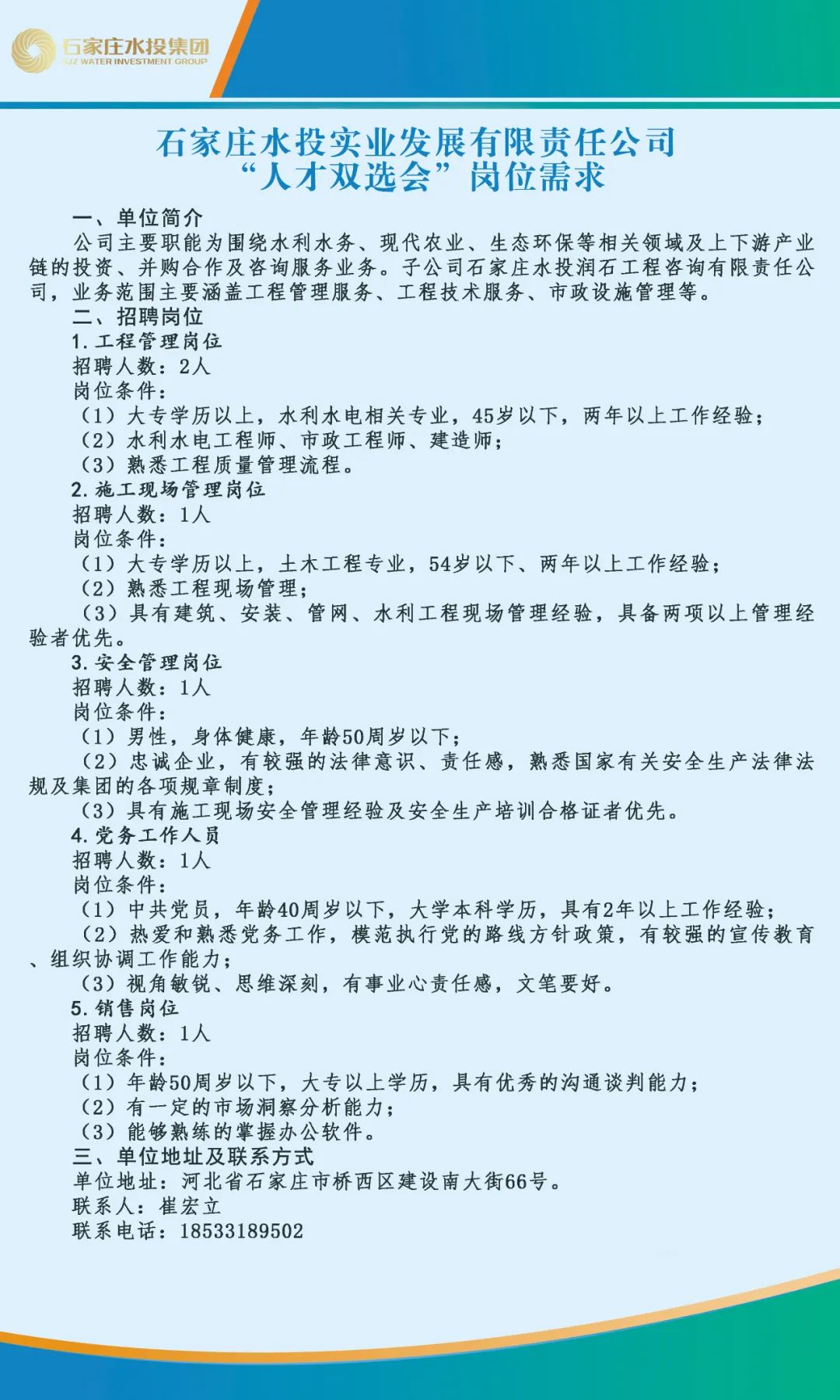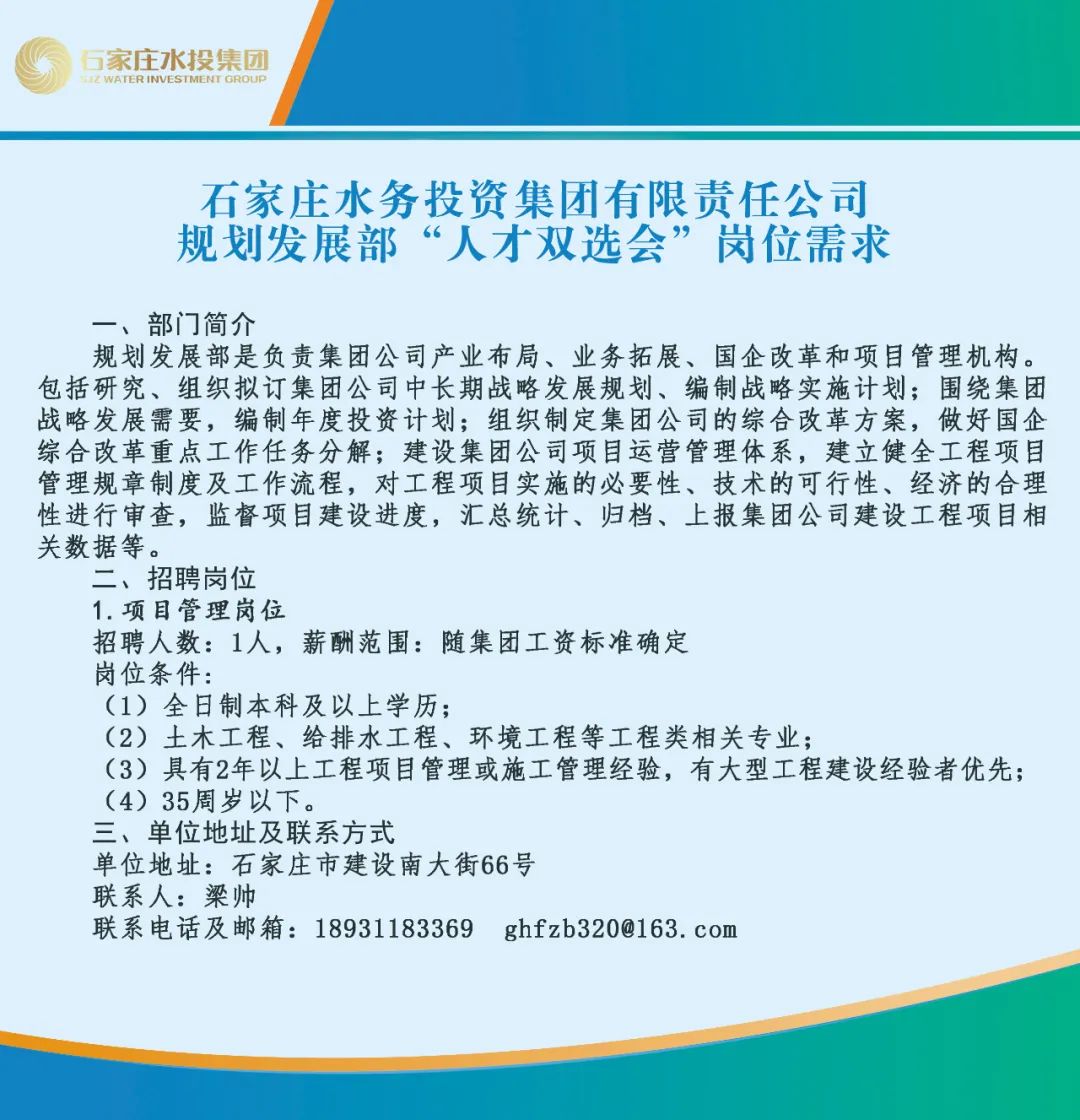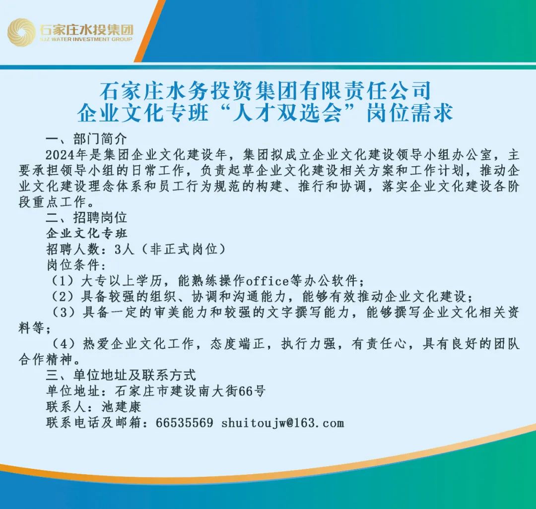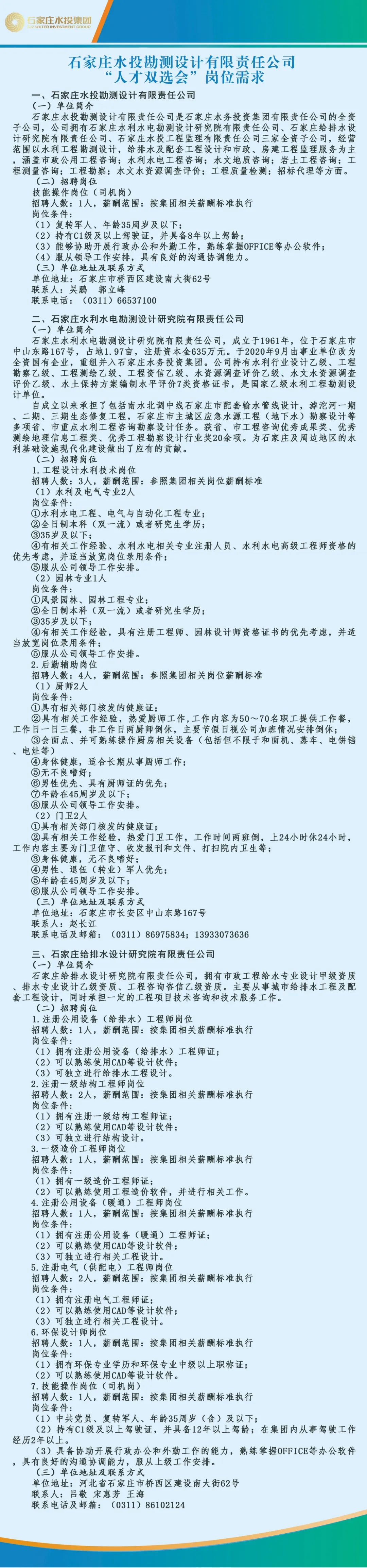为进一步激发集团公司内部活力,盘活人力资源,加强专业人才之间交流,经集团党委研究,决定举办第二届“人才双选会”。现将有关事项公告如下:按照德才兼备的用人标准和“公开、平等、竞争、择优”的原则,面向水投集团内部实行用人单位与专业人才间双向选择。时间:2024年3月19日下午14:00-16:00石家庄水务投资集团有限责任公司面向集团内部提供工程类、财务类、中文类、计算机类等专业,注册工程师、注册结构工程师、消防设施操作等职业资格44个岗位86人。具体岗位、招聘人数、资格条件如下: