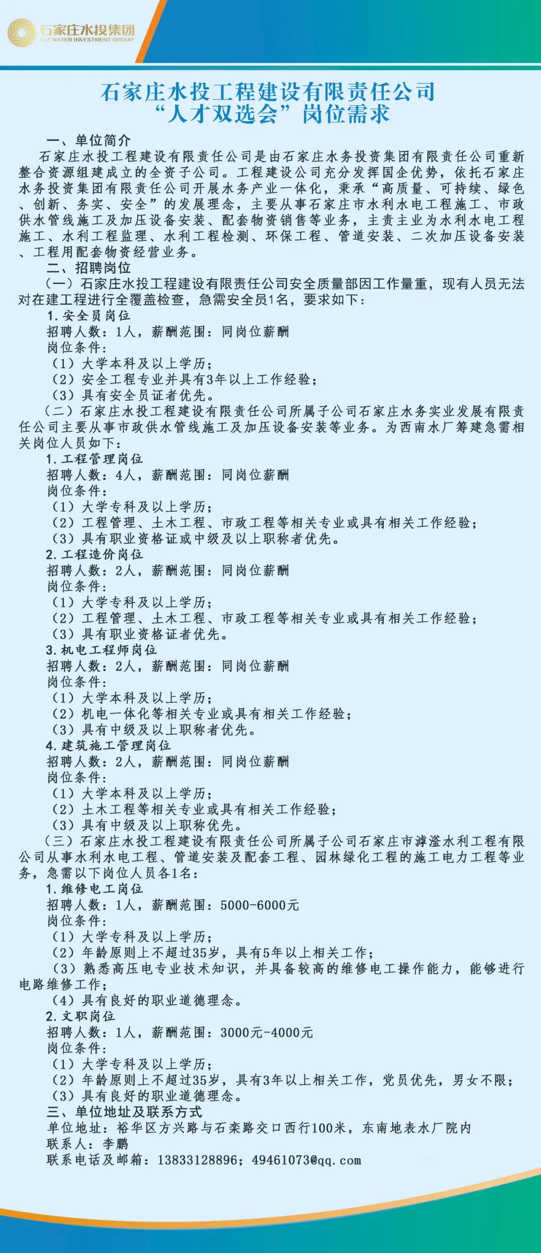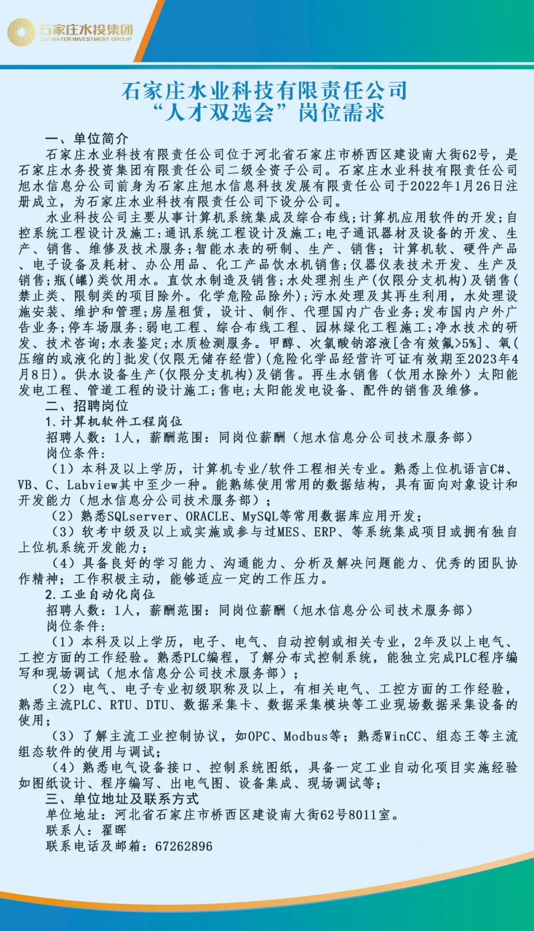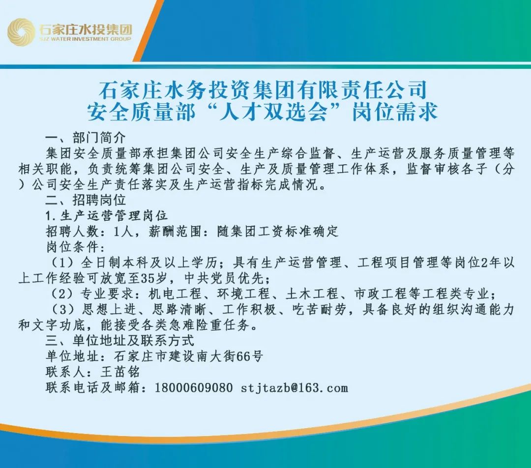 为进一步激发集团公司内部活力,盘活人力资源,加强专业人才之间交流,经集团党委研究,决定举办第二届“人才双选会”。现将有关事项公告如下:按照德才兼备的用人标准和“公开、平等、竞争、择优”的原则,面向水投集团内部实行用人单位与专业人才间双向选择。时间:2024年3月19日下午14:00-16:00石家庄水务投资集团有限责任公司面向集团内部提供工程类、财务类、中文类、计算机类等专业,注册工程师、注册结构工程师、消防设施操作等职业资格44个岗位86人。具体岗位、招聘人数、资格条件如下: