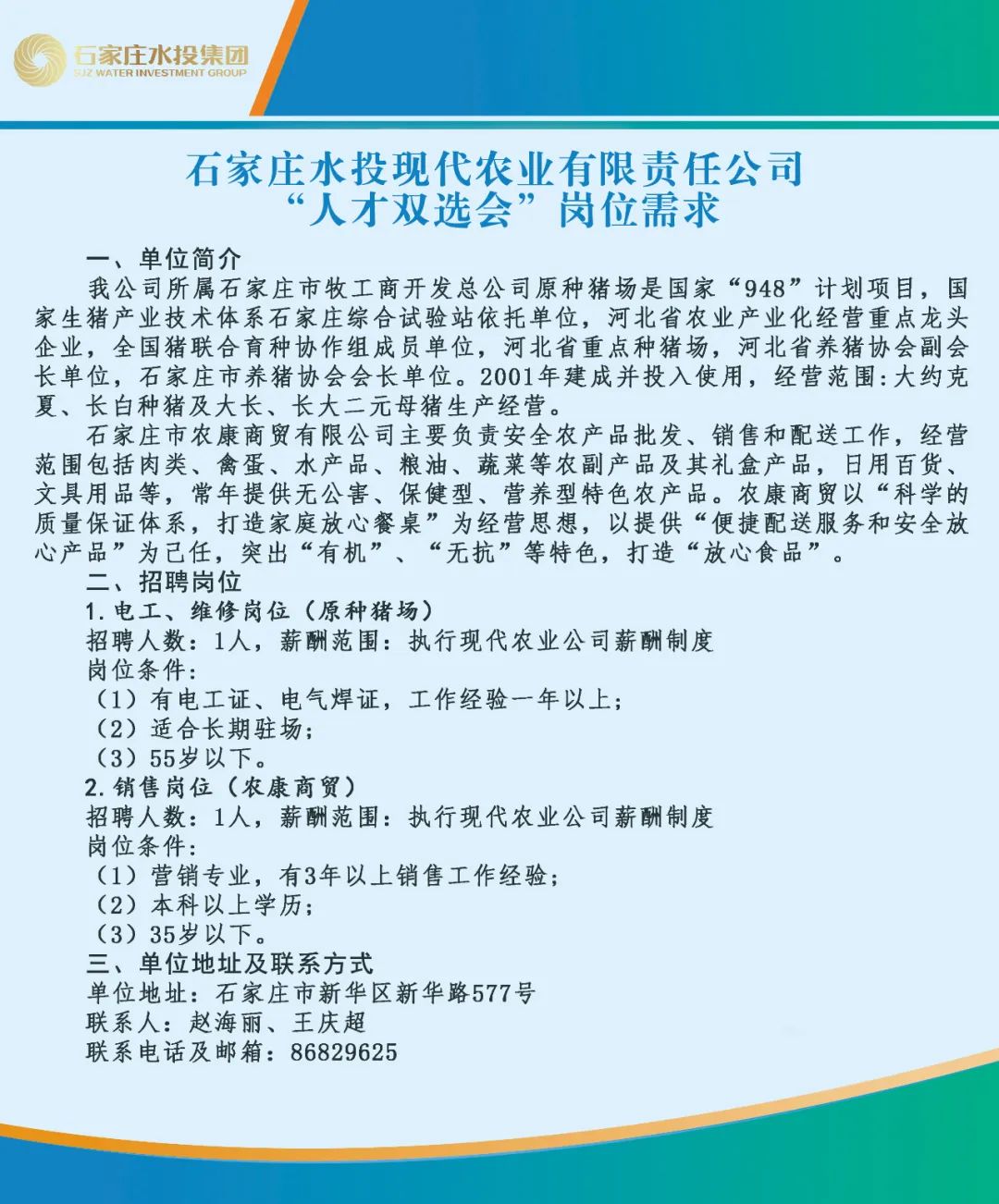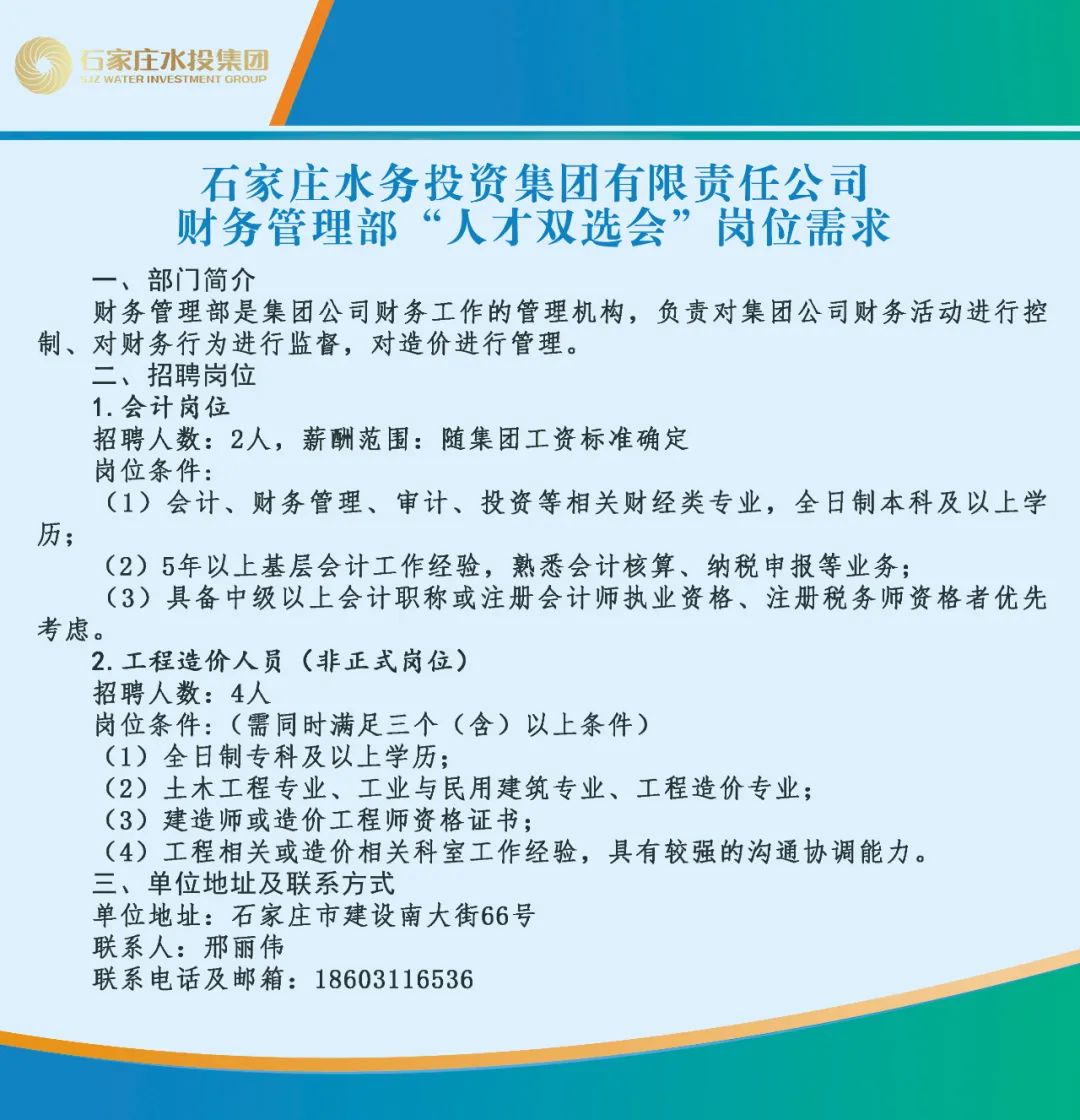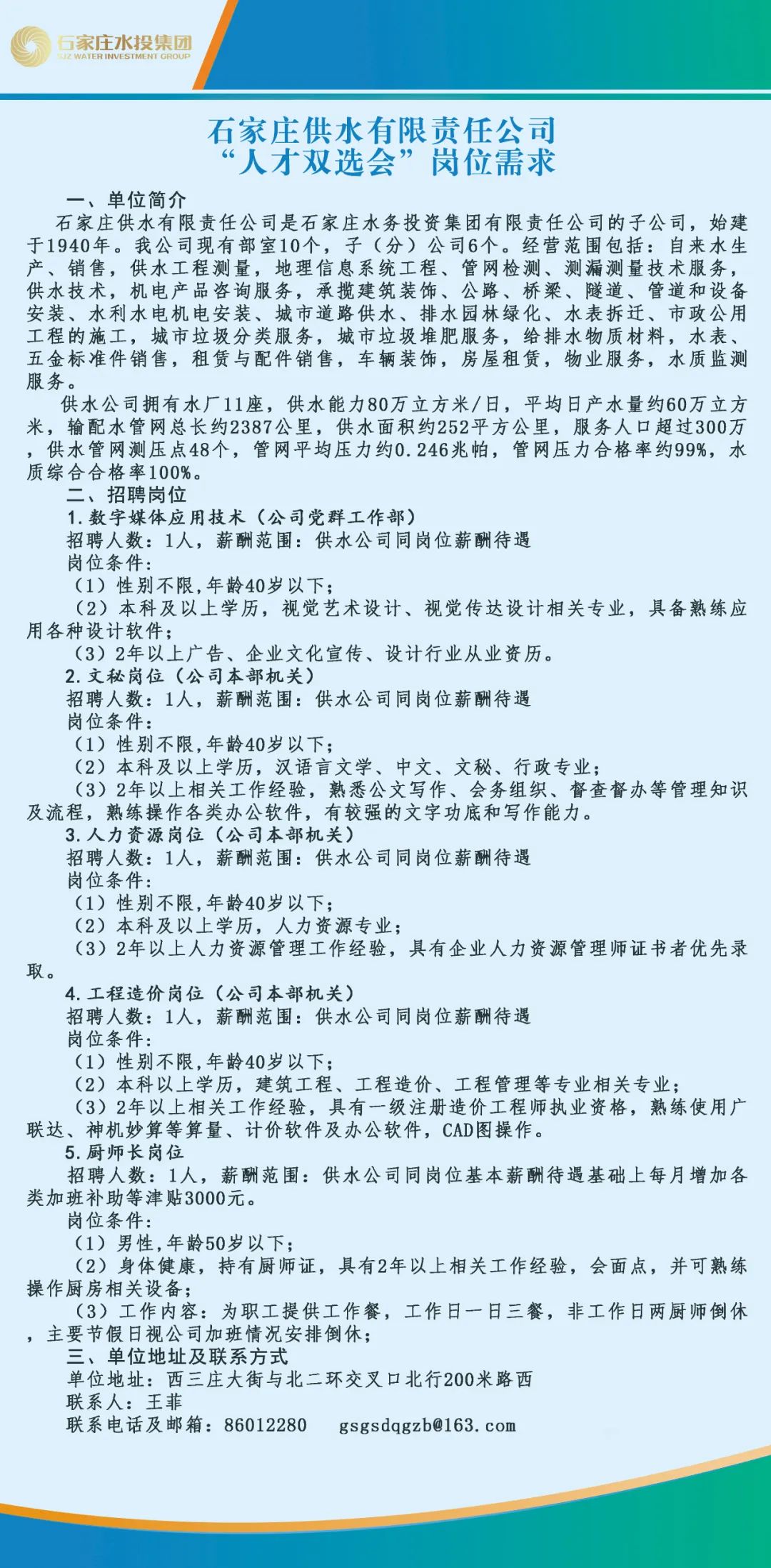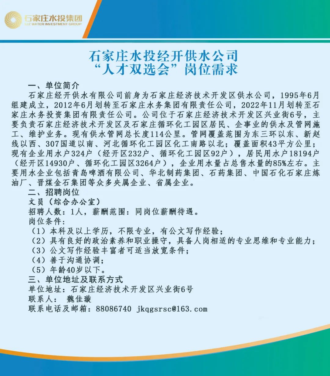 为进一步激发集团公司内部活力,盘活人力资源,加强专业人才之间交流,经集团党委研究,决定举办第二届“人才双选会”。现将有关事项公告如下:按照德才兼备的用人标准和“公开、平等、竞争、择优”的原则,面向水投集团内部实行用人单位与专业人才间双向选择。时间:2024年3月19日下午14:00-16:00石家庄水务投资集团有限责任公司面向集团内部提供工程类、财务类、中文类、计算机类等专业,注册工程师、注册结构工程师、消防设施操作等职业资格44个岗位86人。具体岗位、招聘人数、资格条件如下: