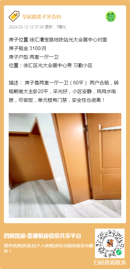 房子户型:两室一厅一卫描述:房子是两室一厅一卫(60平) 两户合租,转租朝南大主卧20平,采光好,小区安静,民用水电燃,可做饭,单元楼有门禁,安全性也很高!房租:3100/月 季付 压一付三 房东直租,可办居住证!12号线漕宝路地铁站700米。周边情况:光大会展中心在马路对面(在这上班的幸福了!5分钟通勤)徐汇日月光500米\第八人民医院500米,第六人民医院1公里!出小区,非常多的吃的和菜店、牛奶店,超市,便利店等!很便宜!另外,距离菜市场200米,离康健园500米,离桂林公园900米。