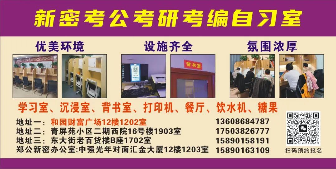 新密报考公务员研究生事业编的好消息!郑公教育新密财富广场自习室、西广场自习室、百货楼自习室已正式对外开放!地址:导航上搜“郑公教育自习室”即可,咨询报名电话13608684787微信同号!