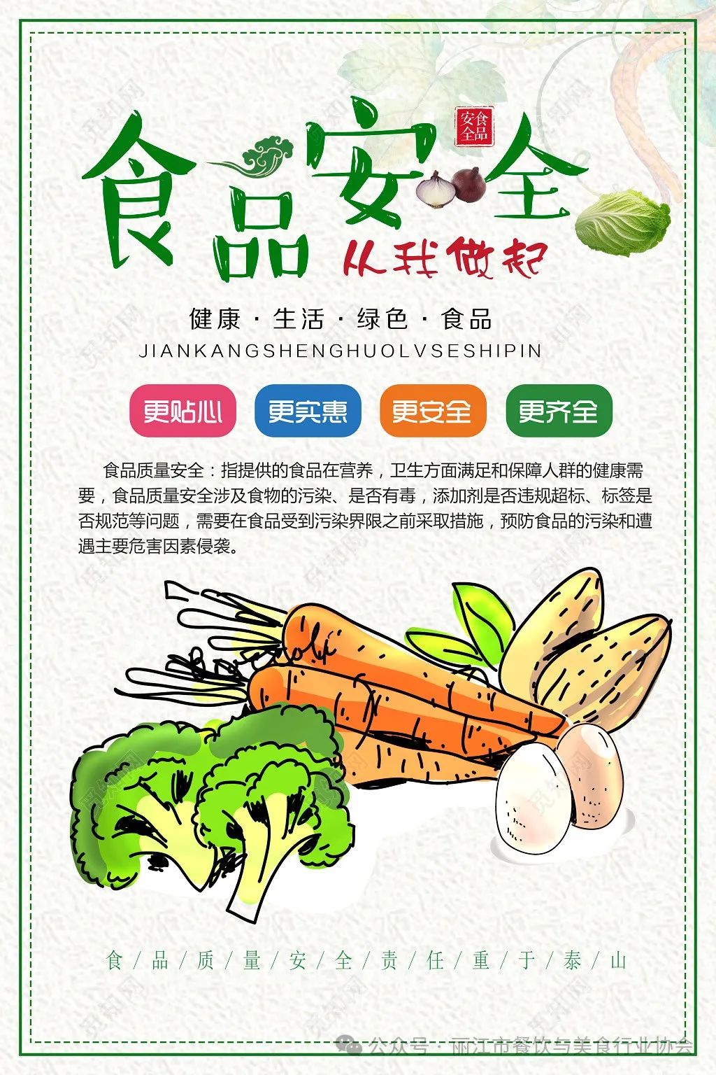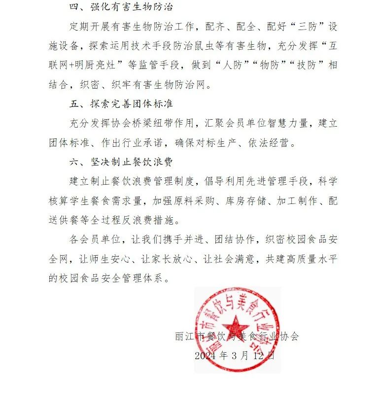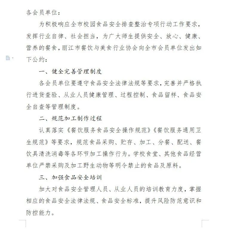 为切实保障校园师生饮食安全,自2024年1月起,丽江市人民政府食品安全委员会办公室、丽江市教育体育局、丽江市公安局、丽江市卫生健康委员会、丽江市市场监督管理局将在全市范围内联合开展为期半年的校园食品安全排查整治专项行动。在此,丽江市餐饮与美食行业协会向全市高校、中小学、幼儿园、校外供餐单位、学校食堂承包(委托)经营企业和广大餐饮服务提供者发出如下倡议: