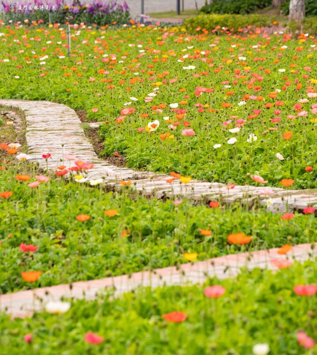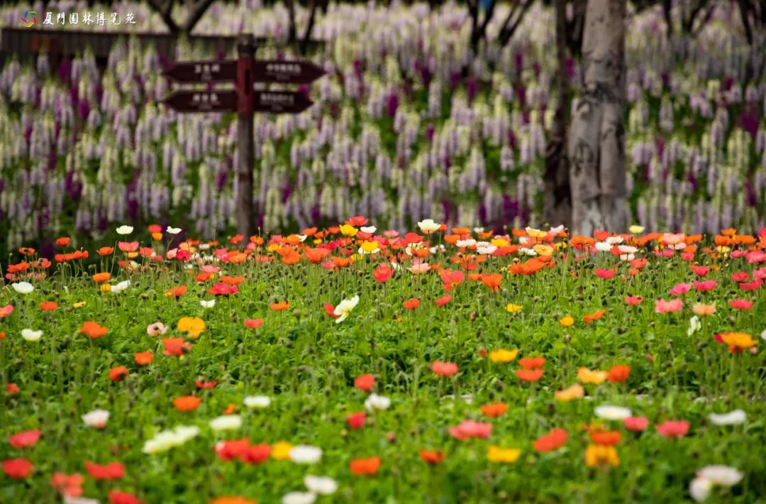 虞美人开得艳丽非凡,白色、黄色、橙色、粉色等汇成6000平方米的花海,春风拂过,掀起绚烂的花浪。