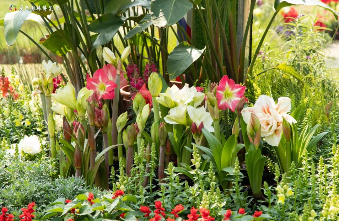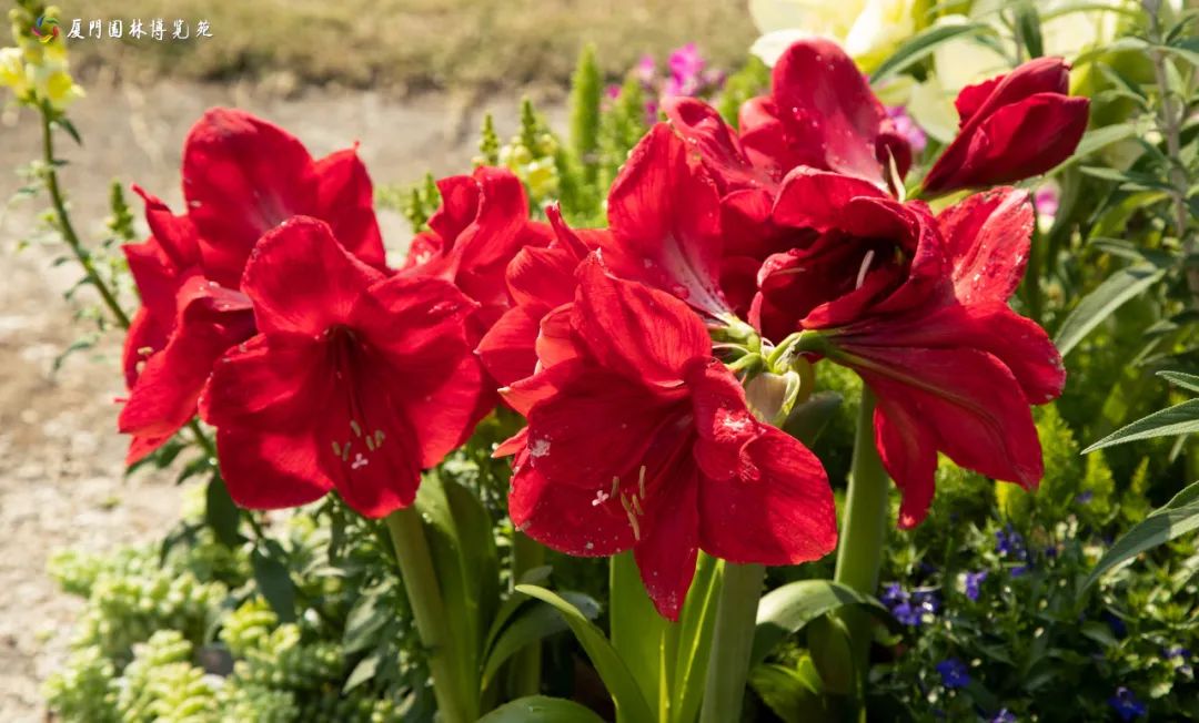 这里汇聚了品种丰富的朱顶红,花色柔和艳丽,花朵硕大肥厚。朱顶红的花语是“在任何境遇中都坚持正确的道路”,其名字的谐音代表“注定红”的美好愿景,适合用来表达爱意和给予鼓励。