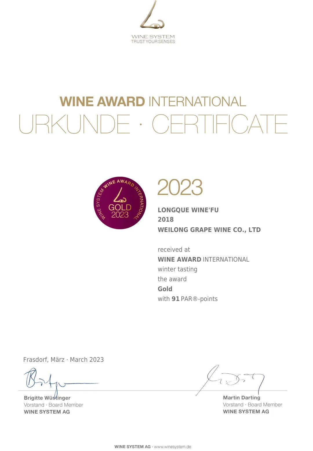 2023德国帕耳国际葡萄酒大赛金奖
